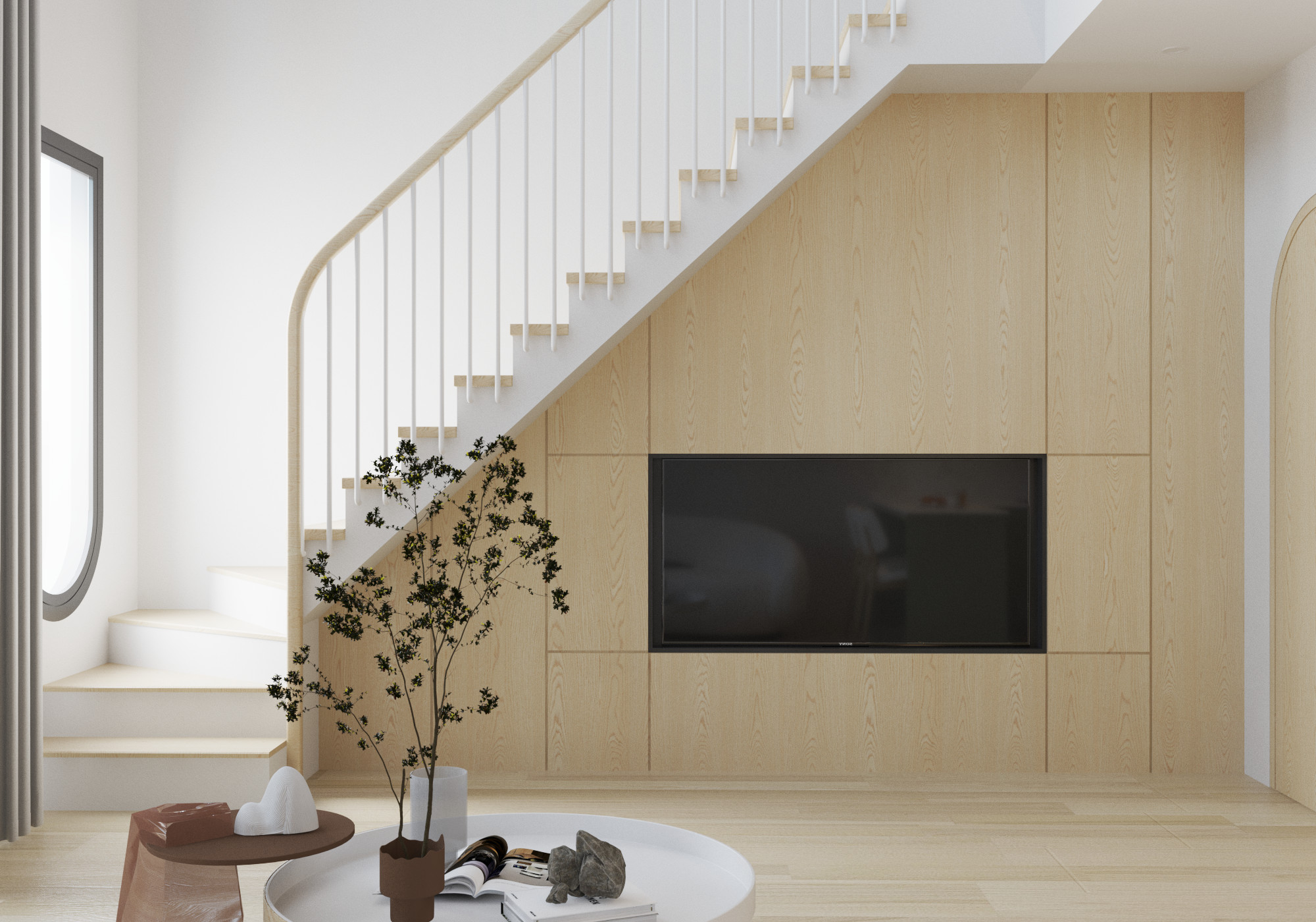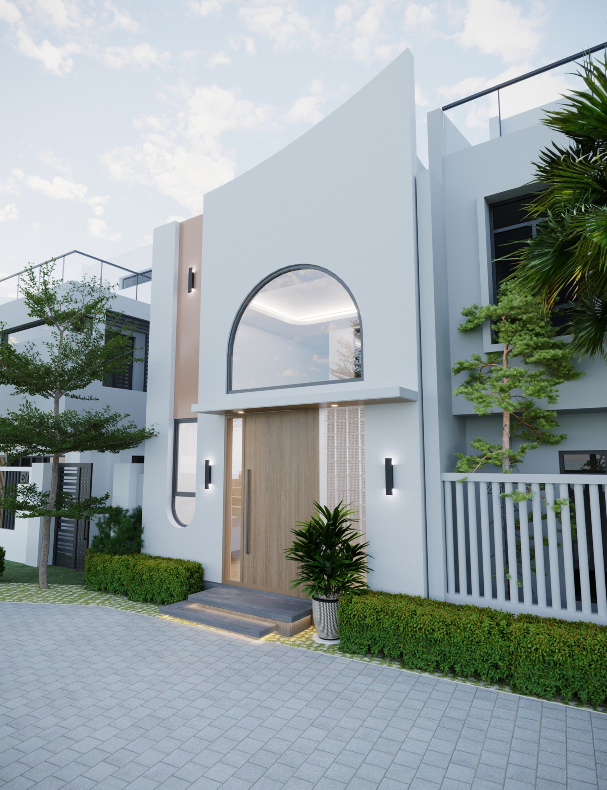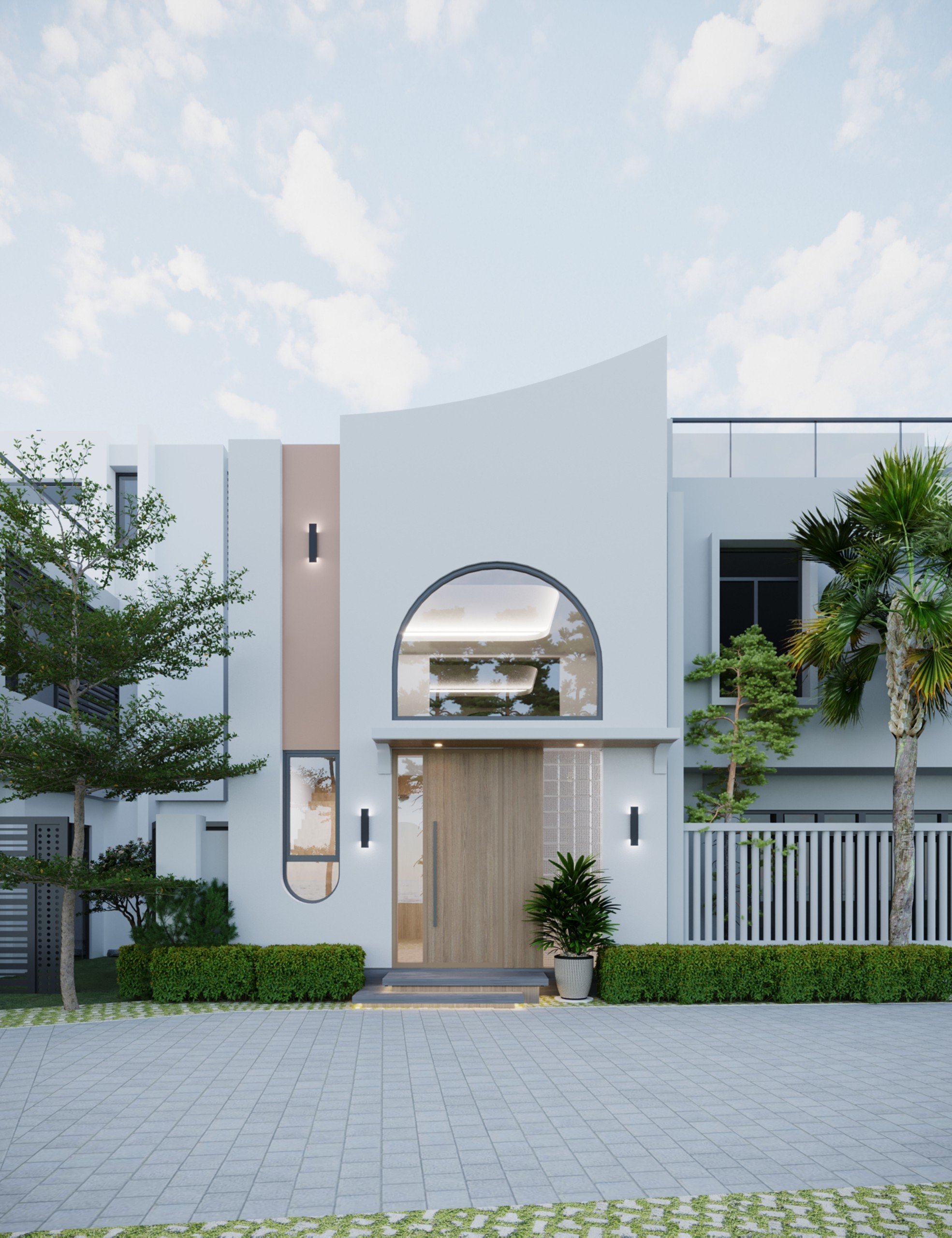 Ngôi nhà mang đậm phong cách tối giản hiện đại với các đường nét đơn giản, hình khối rõ ràng. Tạo điểm nhấn cho ngôi nhà là những đường cong mềm mại ở phần mái và cửa chính, tạo nên sự độc đáo và khác biệt so với các mẫu nhà truyền thống. Sự kết hợp hài hòa giữa các gam màu trung tính như trắng, be, nâu gỗ này tạo nên một không gian thanh lịch, sang trọng và gần gũi với thiên nhiên. Mặt tiền được thiết kế với các hình khối đơn giản nhưng vẫn rất tinh tế. Cửa chính gỗ màu nâu ấm áp tạo điểm nhấn cho mặt tiền. Thiết kế cửa kính lớn kết hợp với cửa gỗ mang đến sự thông thoáng và ánh sáng tự nhiên cho không gian bên trong, mang đến cảm giác ấm cúng và sang trọng cho căn nhà. Cửa sổ kính lớn tầng hai cũng góp phần giúp đón ánh sáng tự nhiên vào bên trong, tạo không gian sống thoáng đãng và trong lành. Việc bố trí cây xanh xung quanh nhà giúp tạo không gian sống xanh mát và trong lành.