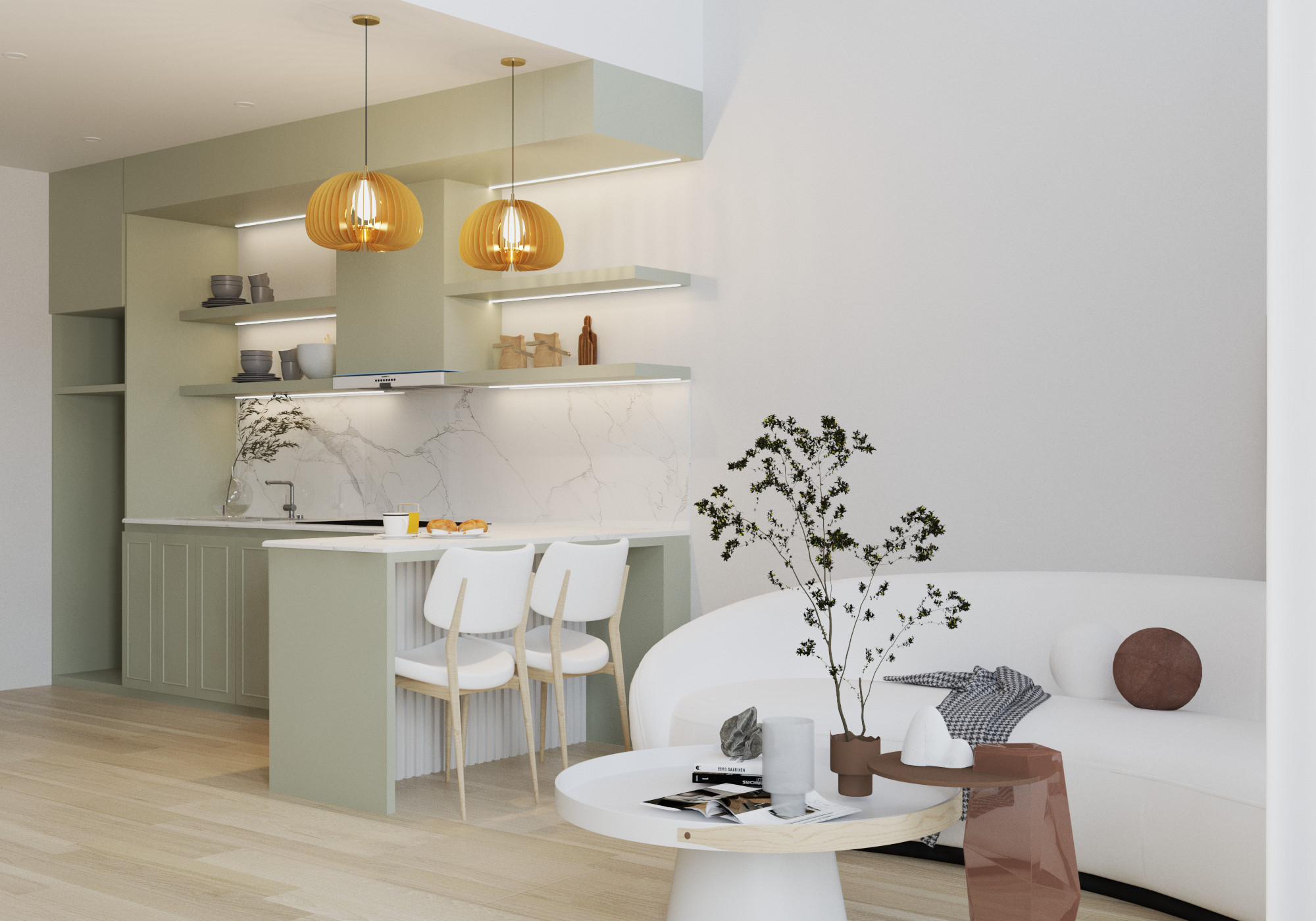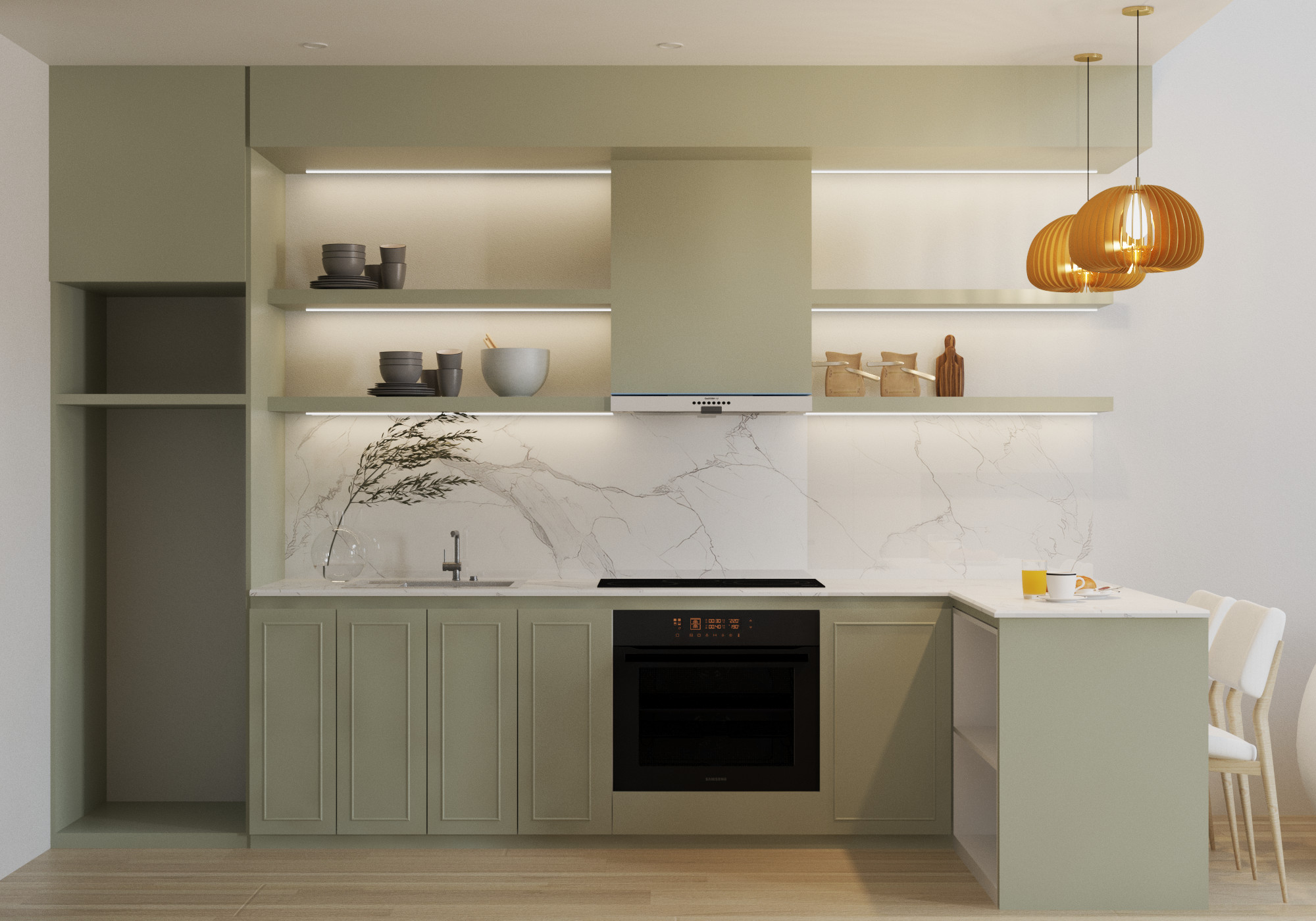 Phòng bếp cũng mang đậm phong cách tối giản hiện đại với các đường nét đơn giản, hình khối rõ ràng. Bên cạnh đó, chi tiết tủ bếp với các đường kẻ dọc lại mang đến một chút hơi hướng cổ điển, tạo nên sự cân bằng hài hòa. Điểm nhấn của căn bếp là sự kết hợp hài hòa giữa màu xanh lá cây nhạt của tủ bếp và màu trắng của mặt bàn đá. Sự kết hợp này tạo cảm giác tươi mát, gần gũi với thiên nhiên khi nấu ăn trong một không gian thư giãn như vậy. Phòng bếp được thiết kế tập trung vào các yếu tố cơ bản, không quá cầu kỳ, tạo nên một không gian gọn gàng, dễ dàng vệ sinh. Tủ bếp được thiết kế với nhiều ngăn kéo và kệ, giúp tối ưu hóa không gian chứa đồ. Phần trên của tủ bếp được thiết kế mở với các kệ trang trí, tạo điểm nhấn cho không gian. Lựa chọn mặt bàn đá màu trắng sáng bóng không chỉ đẹp mắt mà còn dễ dàng vệ sinh. Bếp nấu được thiết kế đặt âm tủ, giúp tiết kiệm không gian và tạo nên một bề mặt liền mạch. Hệ thống đèn chiếu sáng được bố trí hợp lý, vừa đủ sáng vừa tạo điểm nhấn cho không gian. Sàn nhà bằng gỗ mang đến cảm giác ấm cúng và sang trọng.