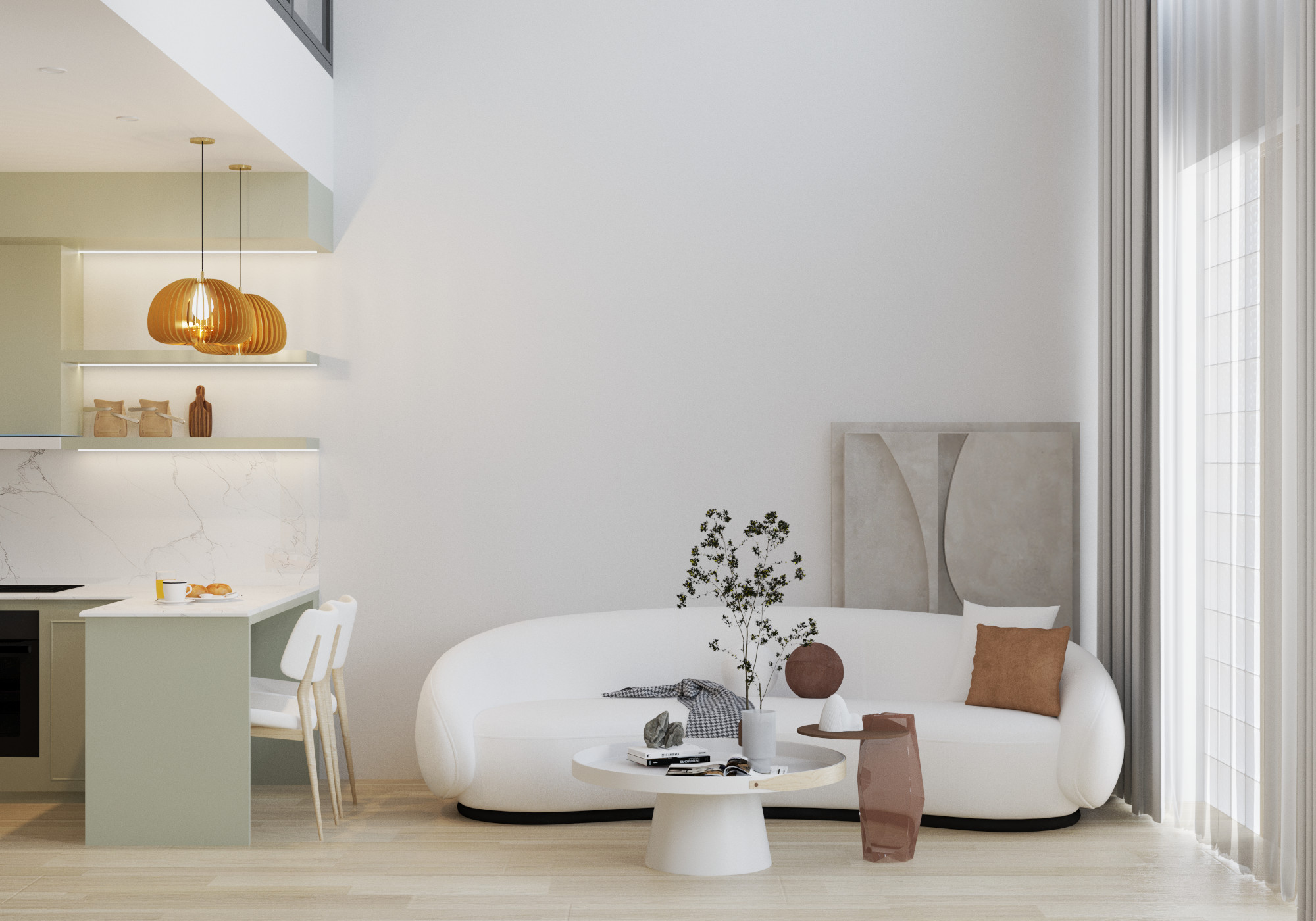 Yêu cầu thiết kế: Tông trắng chủ đạo tạo cảm giác hài hòa, thư thái cho gia chủ – Kiến tạo không gian sống nhẹ nhàng, thanh lịch với phong cách tối giản, thanh lịch, đáp ứng công năng 1 phòng khách, 1 phòng bếp, 1 phòng tắm, 1 phòng ngủ.