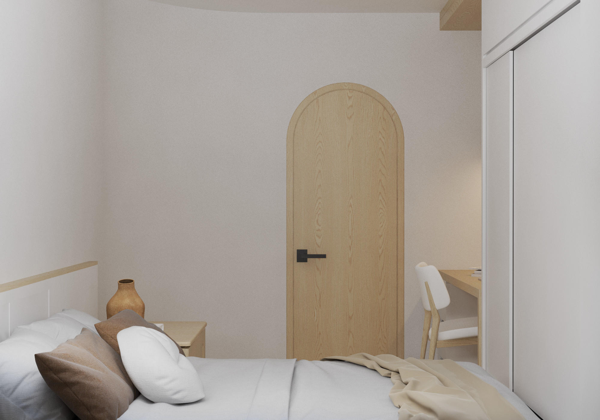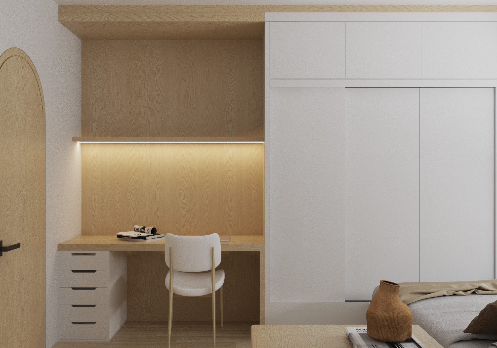 Căn phòng thể hiện rõ nét phong cách tối giản với đường nét thiết kế đơn giản, không cầu kỳ, pha lẫn một chút phong cách Nhật Bản qua việc sử dụng gỗ tự nhiên, màu sắc ấm áp với nội thất và cách bày trí trong phòng. Việc sử dụng chủ yếu các hình khối cơ bản, màu sắc nhẹ nhàng trung tính và hạn chế đồ trang trí tạo nên không gian gọn gàng, tinh tế. Căn phòng được thiết kế đa năng, vừa là phòng ngủ vừa là không gian làm việc Vật liệu gỗ được sử dụng làm điểm nhấn cho bức tường phía sau bàn làm việc, mang đến cảm giác ấm cúng, thoải mái. Tủ quần áo được thiết kế âm tường giúp tiết kiệm không gian và tạo nên vẻ ngoài gọn gàng cho căn phòng. Việc sử dụng ánh sáng gián tiếp từ đèn LED âm tường tạo ra không gian làm việc thoải mái và thư giãn. Cửa vòm mang đến nét mềm mại và độc đáo cho căn phòng. Sàn gỗ giúp tăng thêm vẻ đẹp tự nhiên và ấm áp cho không gian. Đây thực sự là một góc lý tưởng giúp chị Hiền có thể tập trung làm việc và nghỉ ngơi.