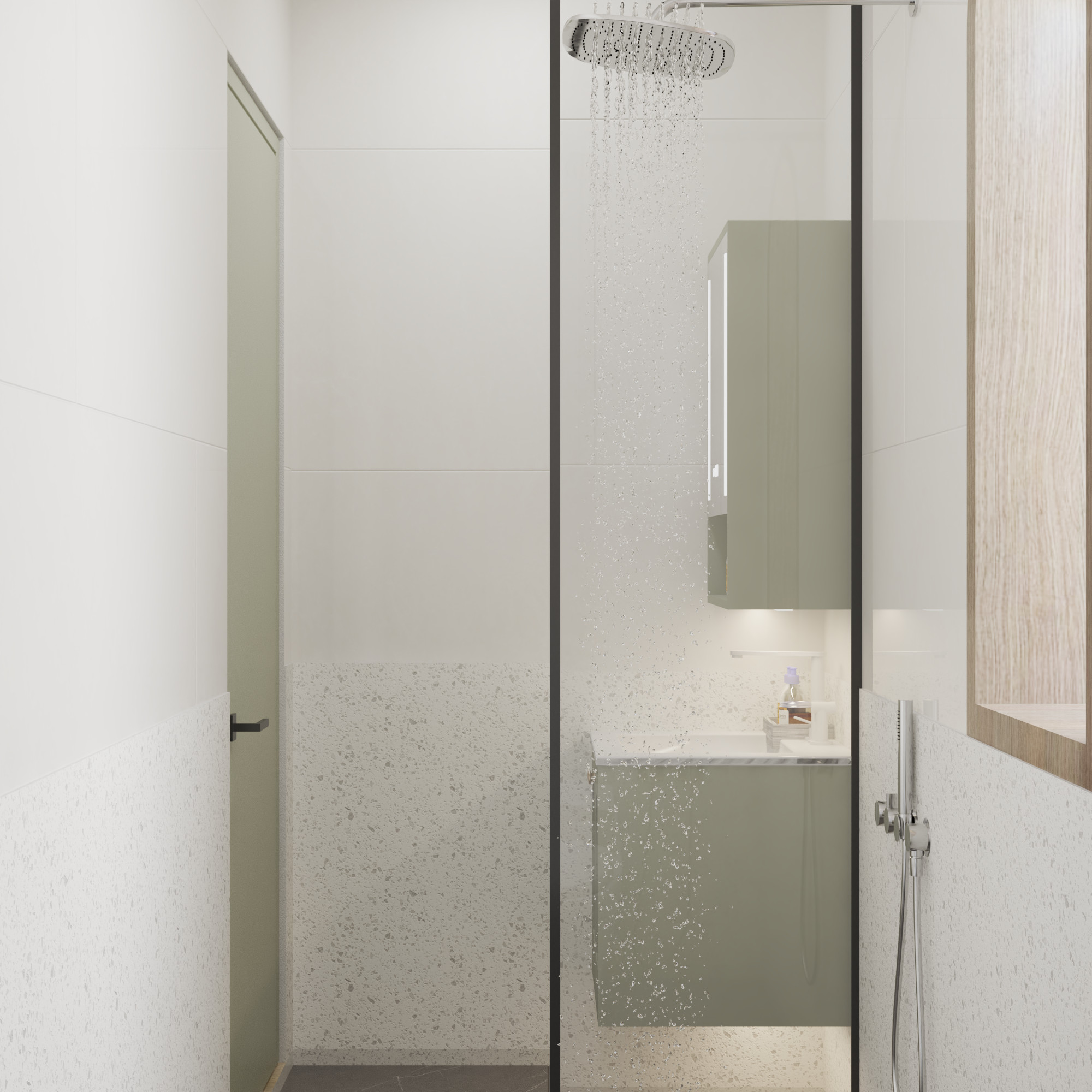 Phòng tắm cũng mang đậm phong cách thiết kế tối giản, hiện đại với các đường nét đơn giản, không quá cầu kỳ. Sự kết hợp hài hòa giữa gạch ốp tường vân đá tự nhiên, gỗ và kính tạo nên một không gian gần gũi với thiên nhiên, mang lại cảm giác nhẹ nhàng thư thái. Chi tiết cửa sổ vòm và các đường kẻ trên tủ lavabo mang đến một chút hơi hướng vintage, tạo điểm nhấn thú vị cho căn phòng. Phòng tắm được ốp oại gạch vân đá tự nhiên với tông màu sáng, tạo cảm giác rộng rãi và sang trọng cho không gian. Tủ chứa đồ và bục rửa mặt cũng được thiết kế đơn giản với gam màu xanh lá vintage, điểm nhấn với chi tiết vòm ở các cánh tủ. Gương lớn với đèn LED giúp không gian trở nên sáng sủa hơn và thuận tiện cho việc sinh hoạt. Cửa sổ vòm bằng gỗ mang đến ánh sáng tự nhiên và tạo điểm nhấn độc đáo cho căn phòng. Vòi sen hiện đại với thiết kế đơn giản, dễ sử dụng. Bồn cầu treo tường giúp không gian trở nên gọn gàng và dễ vệ sinh. Sự kết hợp giữa màu trắng của gạch, màu nâu của gỗ và màu xanh của cây tạo nên một không gian hài hòa và dễ chịu.