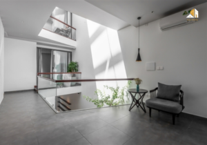 Không chỉ đơn thuần là cung cấp ánh sáng tự nhiên, giếng trời còn có khả năng thông thoáng không khí. Nhờ vào việc lắp đặt các hệ thống thông gió thông qua giếng trời, không khí trong nhà được cung cấp và tuần hoàn một cách hiệu quả. Điều này giúp loại bỏ mùi hôi, độ ẩm và các chất gây ô nhiễm khác trong không gian sống, mang lại một môi trường trong lành cho cả gia đình.