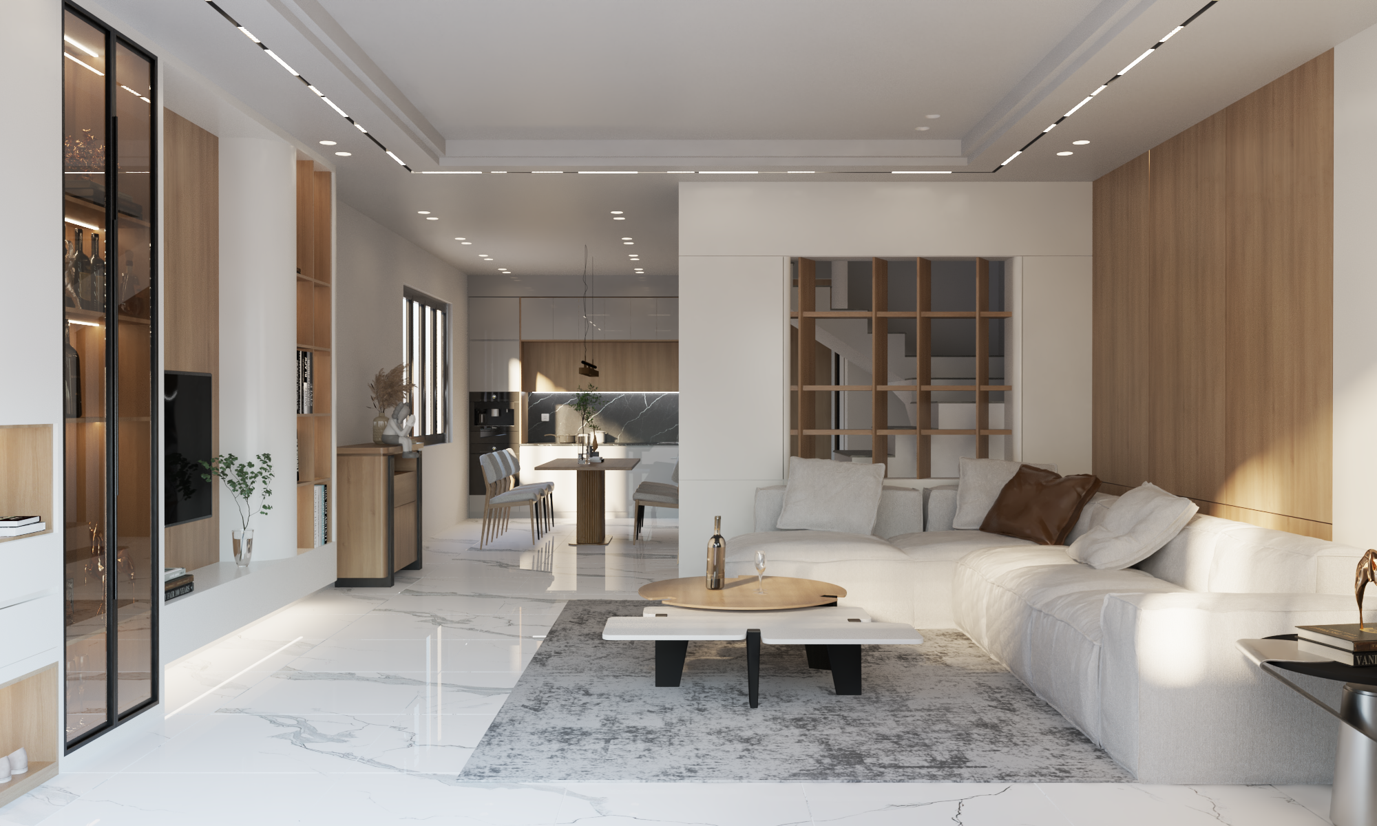 Hướng tới sự tinh giản, hiện đại trong thiết kế, anh Sơn lựa chọn sofa màu trắng vô cùng êm ái cho phòng khách, kết hợp với kệ tủ tivi và kệ tủ rượu, tạo điểm nhấn với một phần mảng tường màu nâu gỗ. Từng điểm nhấn nhỏ trong phòng khách hài hòa đồng điệu, giao thoa với nhau tạo nên một không gian thoải mái, sang trọng. Nhằm tăng cường ánh sáng tự nhiên cho căn phòng, việc lựa chọn cửa sổ và cửa ra vào bằng kính, kết hợp với sử dụng rèm mỏng là một lựa chọn hợp lý, giúp ánh sáng tự nhiên len lỏi vào từng góc nhỏ, làm cho không gian xanh thêm sức sống, đồng thời góp phần tăng thêm tính thẩm mỹ cho căn phòng, giúp căn phòng trở nên sáng sủa hơn. Cách bày trí các kệ tủ cũng hướng tới sự tối ưu hóa không gian: hai kệ tủ đựng sách và kệ tủ rượu được kết hợp liền với kệ tivi, tạo sự liền mạch trong cách bố trí, tận dụng triệt để những khoảng trống của không gian.