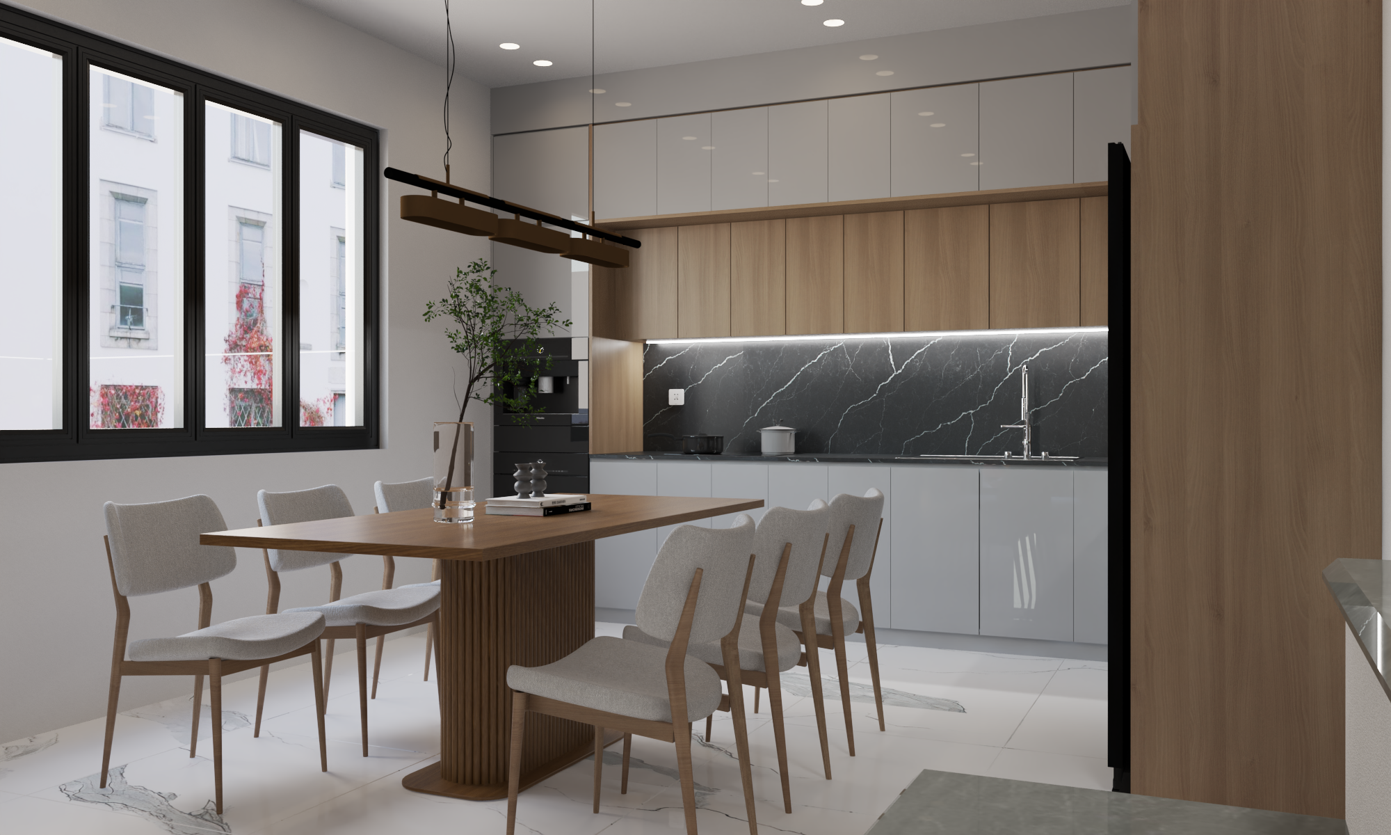Không gian phòng bếp cũng được bố trí vô cùng ngăn nắp, gọn gàng và đầy đủ tiện nghi. Bàn ghế được bày trí giữa phòng, tạo điểm nhấn với chùm đèn được thiết kế đơn điệu ngay bên trên. Nhà bếp, nơi “giữ lửa” cho gia đình và tạo điểm sum họp, đòi hỏi không gian sáng sủa và thoáng đãng. Bởi vậy, việc bố trí cửa sổ bếp sẽ thu hút ánh sáng tự nhiên từ cửa sổ giúp làm sáng rực không gian nấu ăn, tạo cảm giác thoải mái và tăng cường tầm nhìn; giúp tiết kiệm điện vào ban ngày. Ngoài ra, cửa sổ bếp cũng giúp lưu thông không khí và kiểm soát mùi thức ăn; không chỉ mang lại sự thoáng đãng, mà còn tạo cảm giác giao thoa giữa không gian trong và ngoại thất. Việc bố trí nội thất trong phòng bếp liền mạch từ trái qua phải, kệ tủ bằng gỗ điểm xuyến với nội thất hiện đại chính là sự kết hợp hoàn mỹ cho không gian bếp, tạo cảm giác ấm cúng, thân mật trong mỗi bữa cơm gia đình.