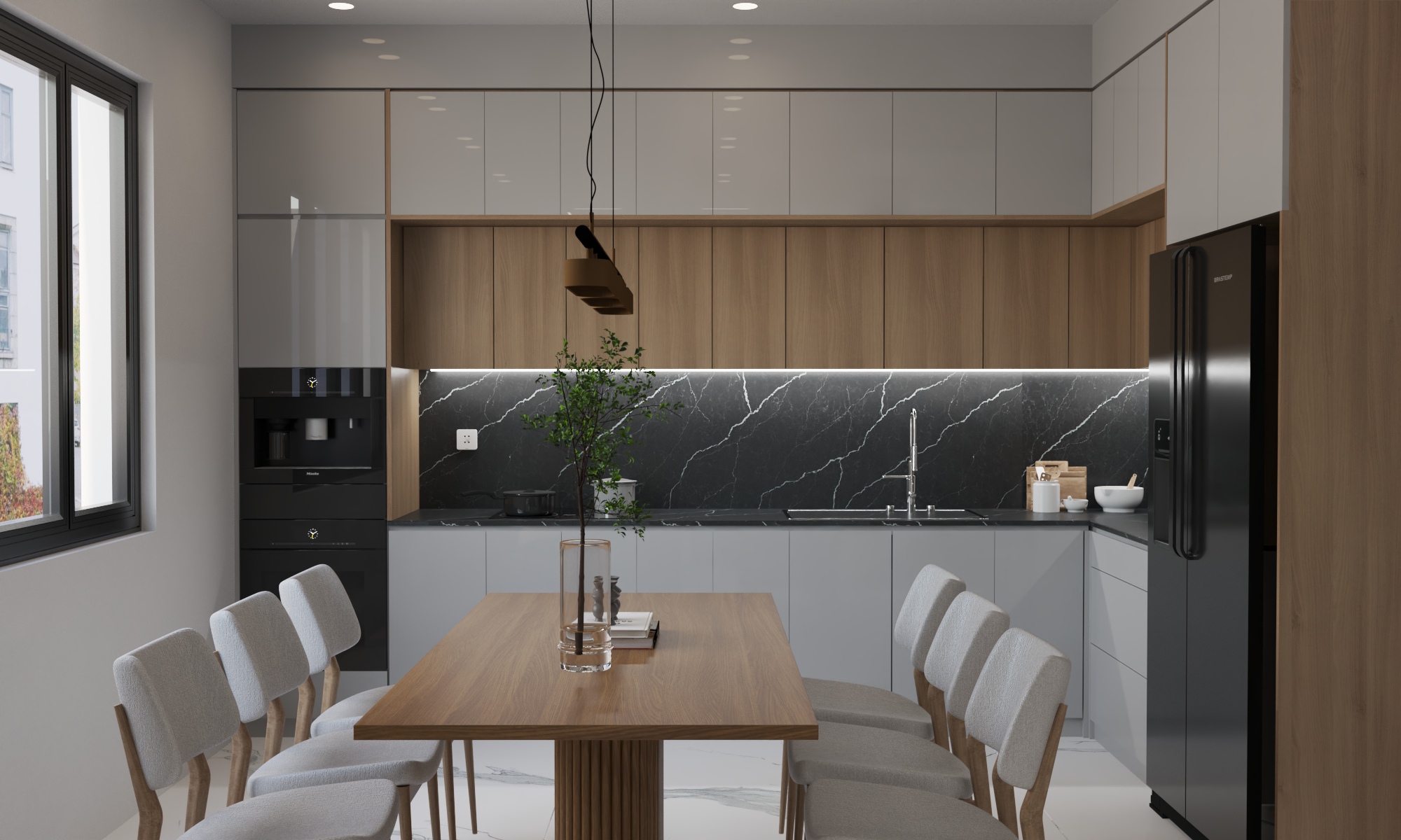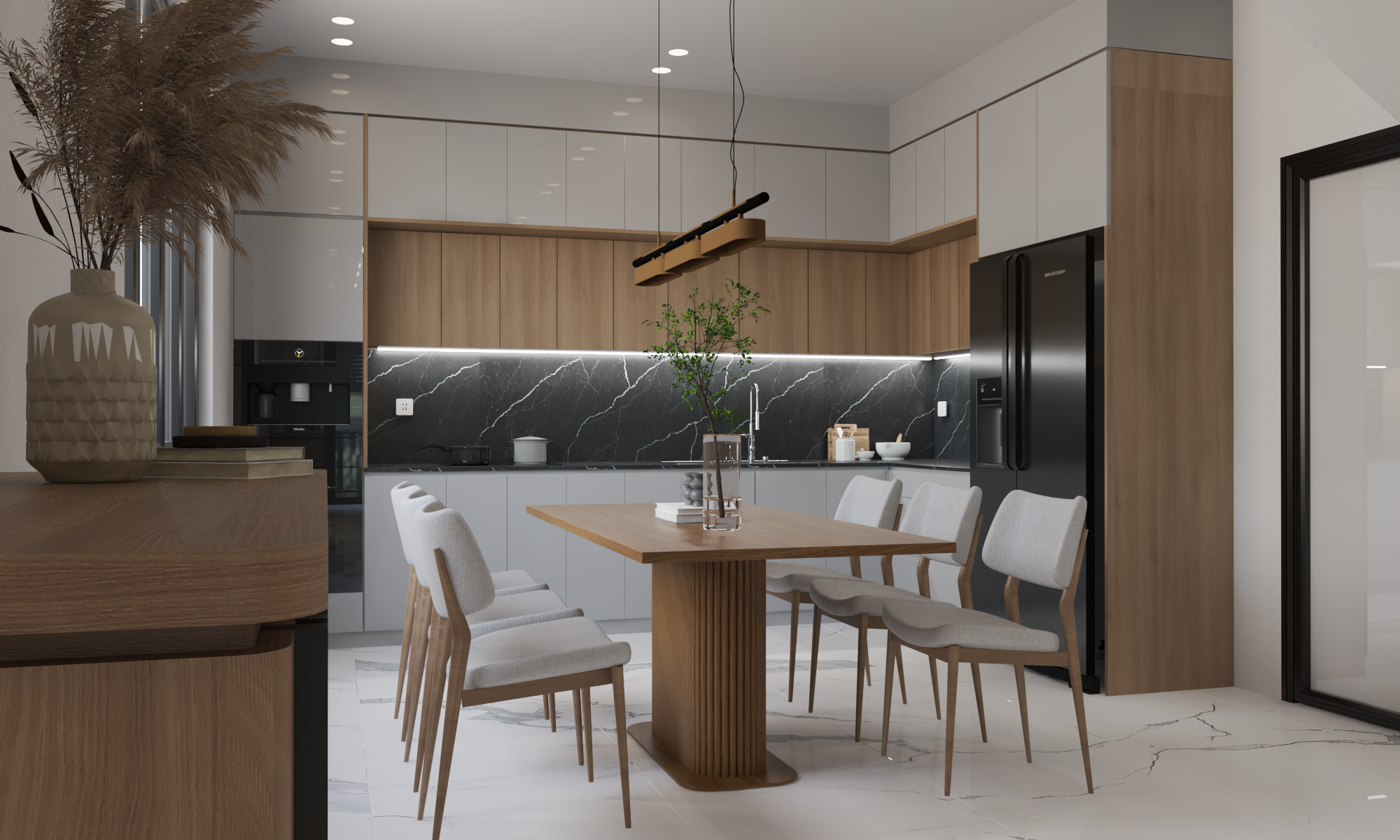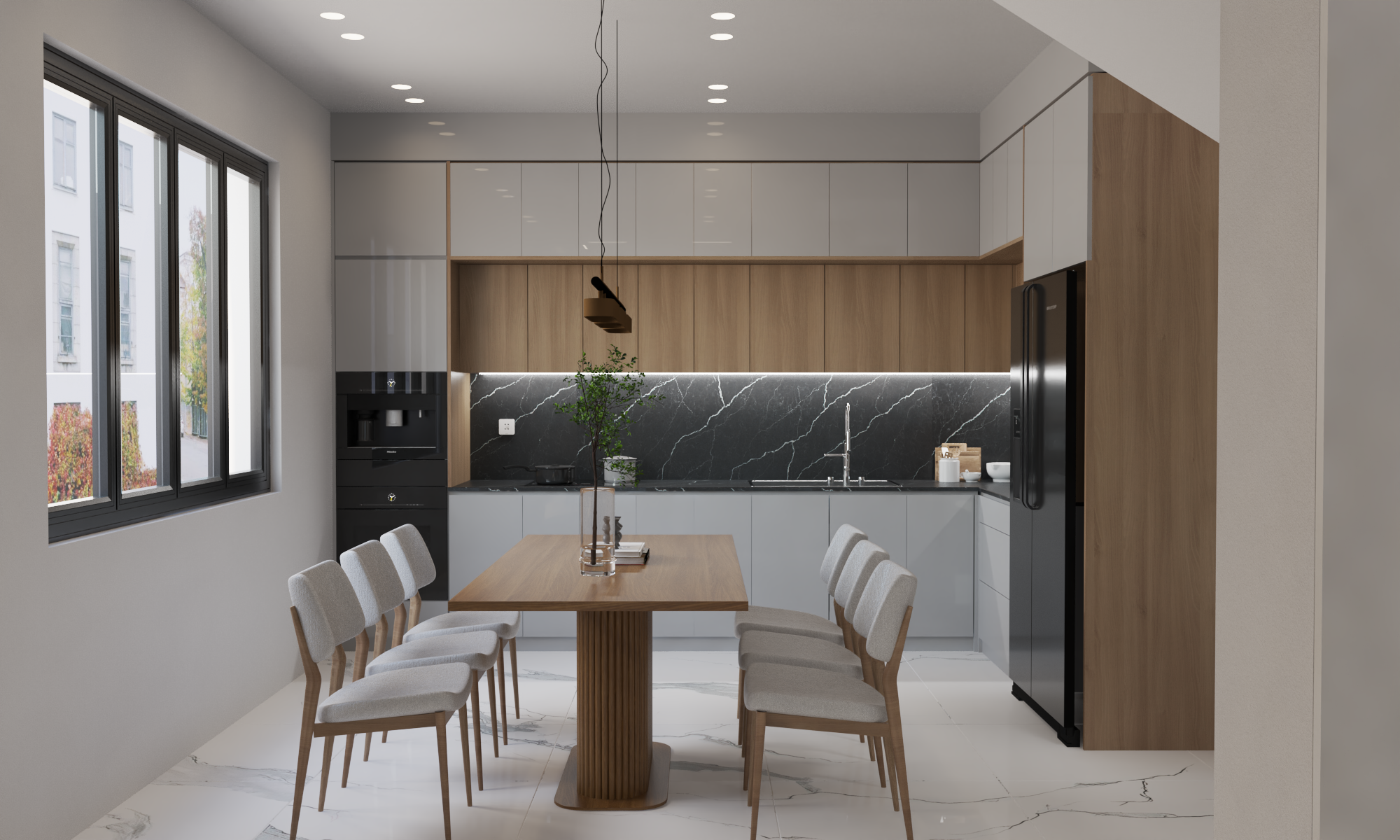 Không gian phòng bếp cũng được bố trí vô cùng ngăn nắp, gọn gàng và đầy đủ tiện nghi. Bàn ghế được bày trí giữa phòng, tạo điểm nhấn với chùm đèn được thiết kế đơn điệu ngay bên trên. Nhà bếp, nơi “giữ lửa” cho gia đình và tạo điểm sum họp, đòi hỏi không gian sáng sủa và thoáng đãng. Bởi vậy, việc bố trí cửa sổ bếp sẽ thu hút ánh sáng tự nhiên từ cửa sổ giúp làm sáng rực không gian nấu ăn, tạo cảm giác thoải mái và tăng cường tầm nhìn; giúp tiết kiệm điện vào ban ngày. Ngoài ra, cửa sổ bếp cũng giúp lưu thông không khí và kiểm soát mùi thức ăn; không chỉ mang lại sự thoáng đãng, mà còn tạo cảm giác giao thoa giữa không gian trong và ngoại thất. Việc bố trí nội thất trong phòng bếp liền mạch từ trái qua phải, kệ tủ bằng gỗ điểm xuyến với nội thất hiện đại chính là sự kết hợp hoàn mỹ cho không gian bếp, tạo cảm giác ấm cúng, thân mật trong mỗi bữa cơm gia đình.