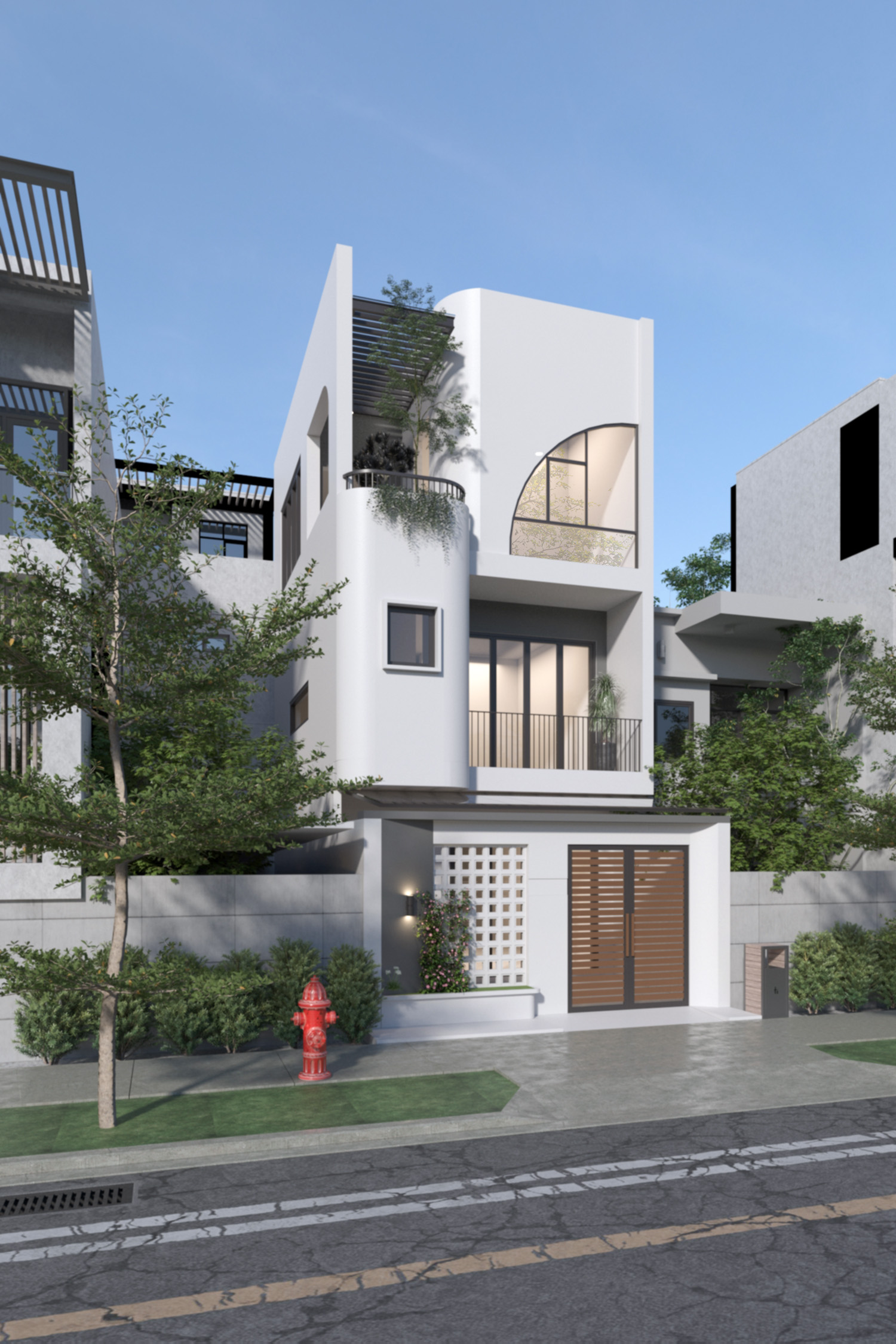Nhìn từ bên ngoài, ngôi nhà toát lên một phong cách sang trọng, hiện đại với các đường nét kiến trúc đơn giản, mạnh mẽ với tông màu trắng chủ đạo. Vẻ đẹp tinh tế và thanh lịch của căn nhà được thể hiện rõ qua việc hạn chế các chi tiết, đường nét cầu kỳ. Mặc dù mang phong cách hiện đại, ngôi nhà vẫn giữ được những nét đặc trưng của kiến trúc Á Đông, thể hiện qua hình khối vuông vắn, mái nhà dốc và sự kết hợp hài hòa giữa các vật liệu tự nhiên và nhân tạo. Cổng nhà màu nâu trầm tạo điểm nhấn ấm áp, kết hợp với hệ thống cửa kính lớn góp phần mang đến sự thông thoáng và hiện đại. Căn nhà càng trở nên độc đáo và đặc sắc hơn với thiết kế phần tường cong ở tầng hap, tạo nên điểm nhấn mềm mại và độc đáo. Nhằm đáp ứng tiêu chí mang thiên nhiên xanh đến gần với khu vực sinh hoạt, anh Long đã lựa chọn thiết kế một chiếc ban công nhỏ ở tầng hai để có thể trồng thêm cây xanh, không những giúp cải thiện không khí mà còn giúp ngôi nhà gần gũi với thiên nhiên tạo không gian sống trong lành, thư giãn. Mái nhà được thiết kế dốc nhẹ, đơn giản, phù hợp với khí hậu nhiệt đới, giúp thoát nước nhanh và tạo hình khối gọn gàng cho ngôi nhà. Hệ thống cửa sổ lớn được bố trí hợp lý, giúp đón trọn ánh sáng tự nhiên ban ngày vào ban ngày. Lựa chọn thiết kế hệ thống cửa kính lớn không chỉ giúp tiết kiệm được điện năng mà còn tạo không gian sống thoáng đãng và tràn đầy năng lượng. Việc sử dụng cửa kính lớn và các vật liệu cách nhiệt giúp tận dụng tối đa ánh sáng tự nhiên và giảm thiểu việc sử dụng điều hòa.