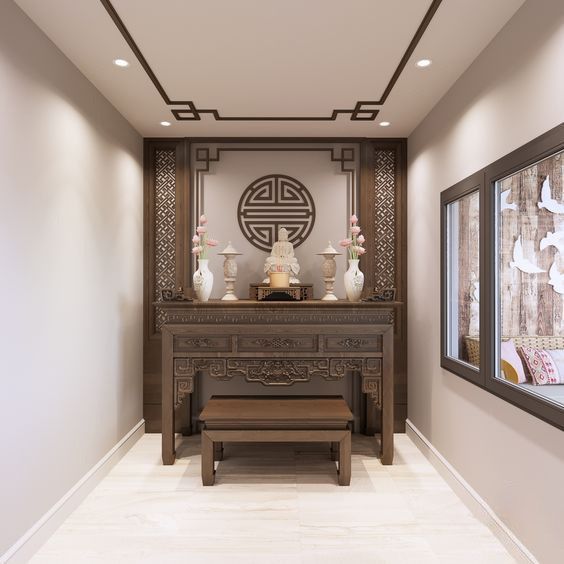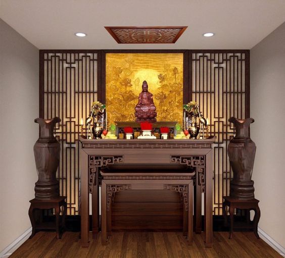 Không gian thờ cúng mang đậm phong cách Á Đông với những đường nét hoa văn tinh xảo, màu sắc trầm ấm, tạo cảm giác trang nghiêm và tôn kính, phù hợp với văn hóa người Việt. Các yếu tố trong không gian được bố trí cân đối, hài hòa, tạo nên một tổng thể thống nhất và đẹp mắt. Việc sử dụng chất liệu gỗ quý, màu sắc ấm áp và các chi tiết chạm khắc tinh xảo mang đến vẻ đẹp sang trọng và đẳng cấp cho không gian. Bàn thờ được làm từ gỗ tự nhiên, có nhiều tầng, tạo không gian bày trí đồ thờ cúng linh thiêng. Tủ thờ được thiết kế với nhiều ngăn kéo, kệ để đồ, giúp sắp xếp đồ thờ cúng gọn gàng và khoa học. Ban thờ được trang trí bằng các bức tranh, hoa văn tinh xảo, tạo điểm nhấn cho không gian. Đèn được sử dụng để chiếu sáng bàn thờ, tạo không gian ấm cúng và trang nghiêm. Lọ hoa được đặt hai bên bàn thờ, thường được làm từ chất liệu sứ hoặc gốm, tạo điểm nhấn cho không gian. Màn che được sử dụng để che chắn bàn thờ khi không sử dụng, tạo không gian riêng tư và tôn nghiêm. Việc sử dụng chất liệu gỗ quý, màu sắc ấm áp và các chi tiết chạm khắc tinh xảo mang đến vẻ đẹp sang trọng và đẳng cấp cho không gian. Các yếu tố trong không gian được bố trí cân đối, hài hòa, tạo nên một tổng thể thống nhất và đẹp mắt.