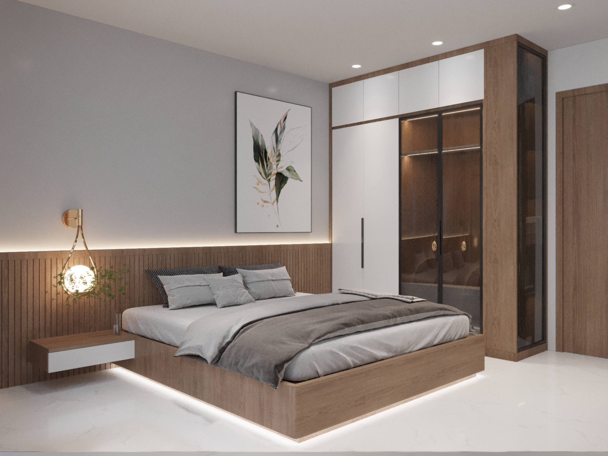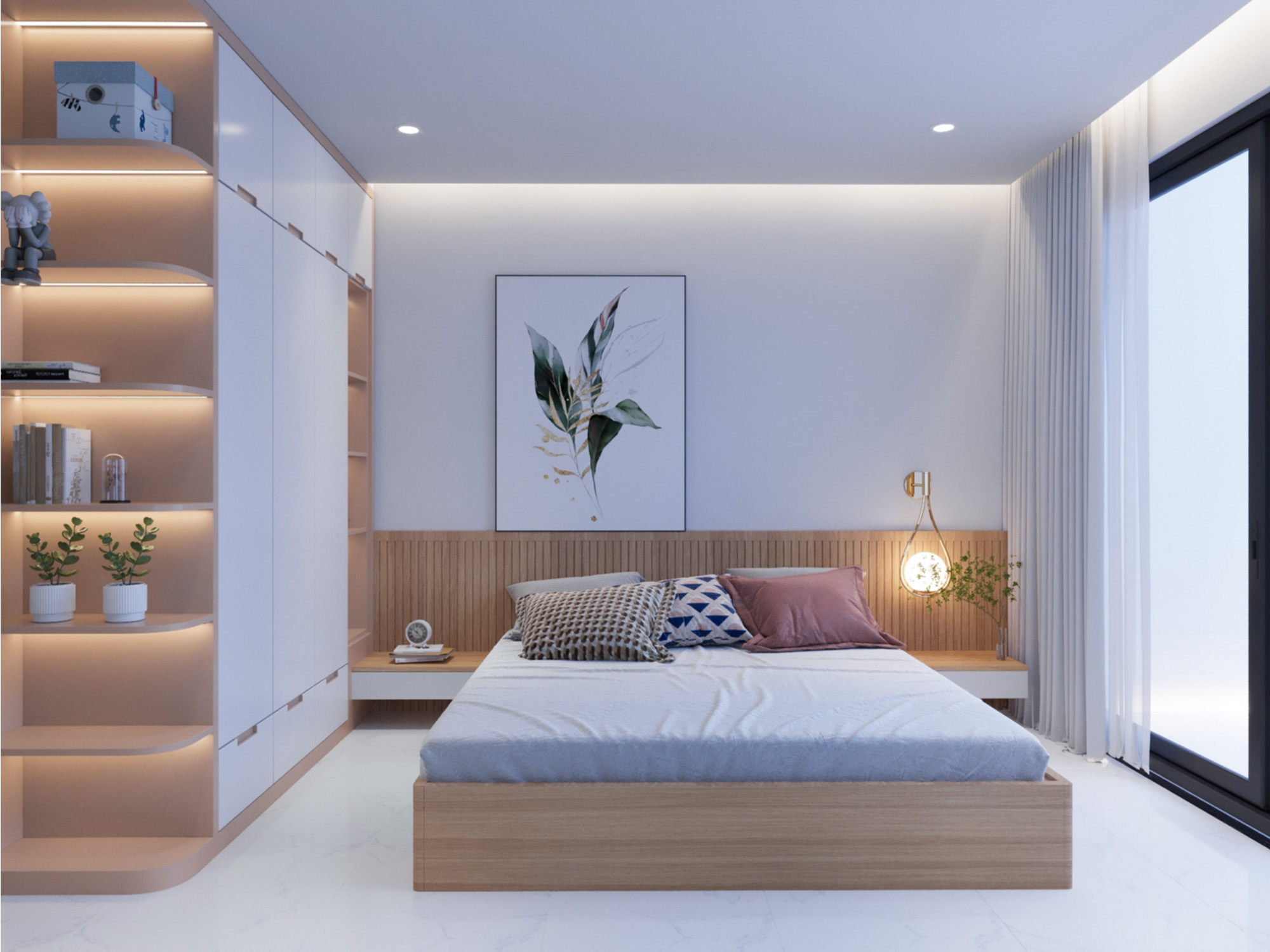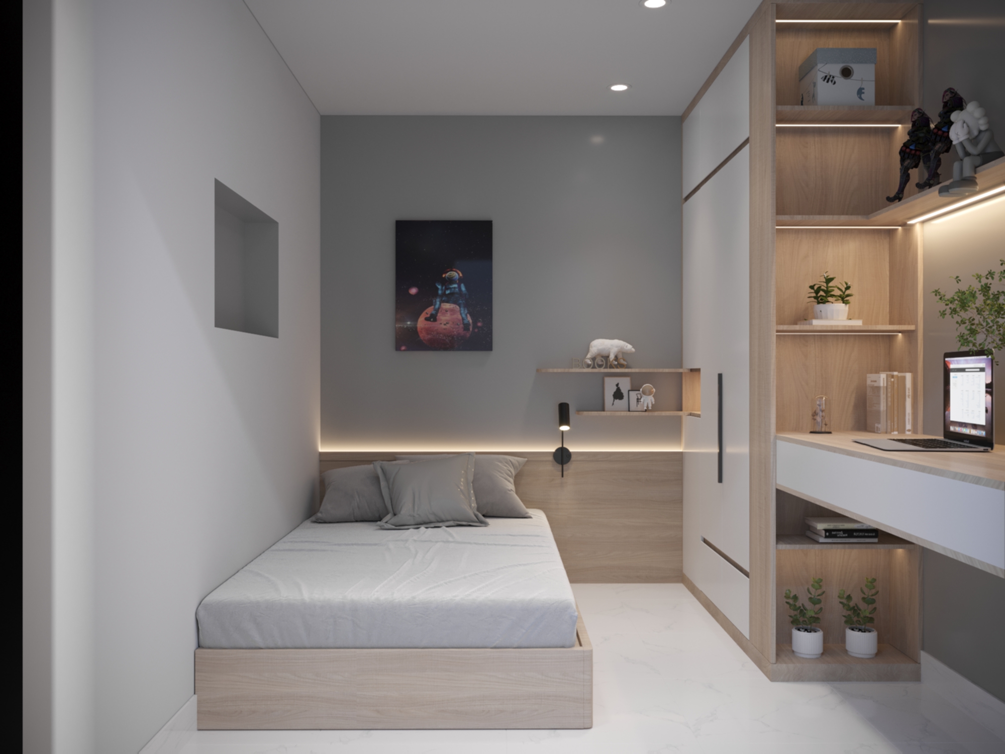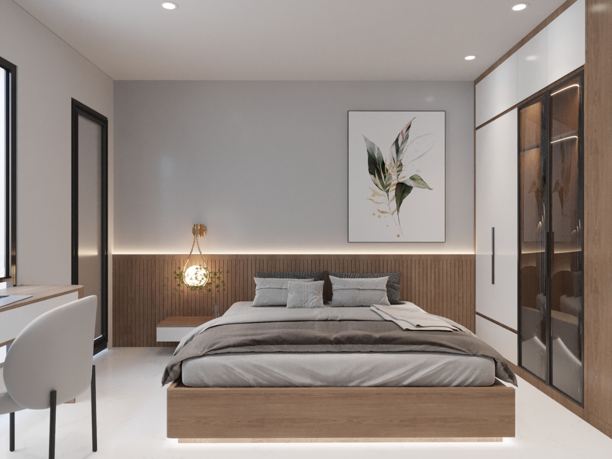 Phòng ngủ mang đậm phong cách hiện đại với các đường nét kiến trúc đơn giản, mạnh mẽ. Việc sử dụng các vật liệu như gỗ, sơn tường màu trung tính tạo nên không gian sống tinh tế và hiện đại với gam màu chủ đạo trắng và màu gỗ, tạo cảm giác rộng rãi và ấm áp. Không gian được thiết kế tối ưu hóa diện tích, tích hợp nhiều chức năng như ngủ, làm việc, học tập. Bên cạnh sự hiện đại, không gian phòng ngủ còn toát lên vẻ ấm cúng nhờ vào việc sử dụng gam màu trung tính, ánh sáng dịu nhẹ và các chi tiết trang trí nhỏ nhắn. Giường ngủ được thiết kế sát tường, tận dụng tối đa diện tích. Tủ quần áo âm tường, thiết kế cánh trượt giúp tiết kiệm diện tích và tạo cảm giác gọn gàng. Bàn làm việc được tích hợp vào khung giường, tạo thành một không gian làm việc nhỏ gọn nhưng vẫn đầy đủ tiện nghi. Kệ sách được thiết kế mở, giúp bạn trưng bày sách, đồ trang trí và cây xanh. Hệ thống đèn chiếu sáng được bố trí hợp lý, vừa đủ sáng vừa tạo điểm nhấn cho không gian.