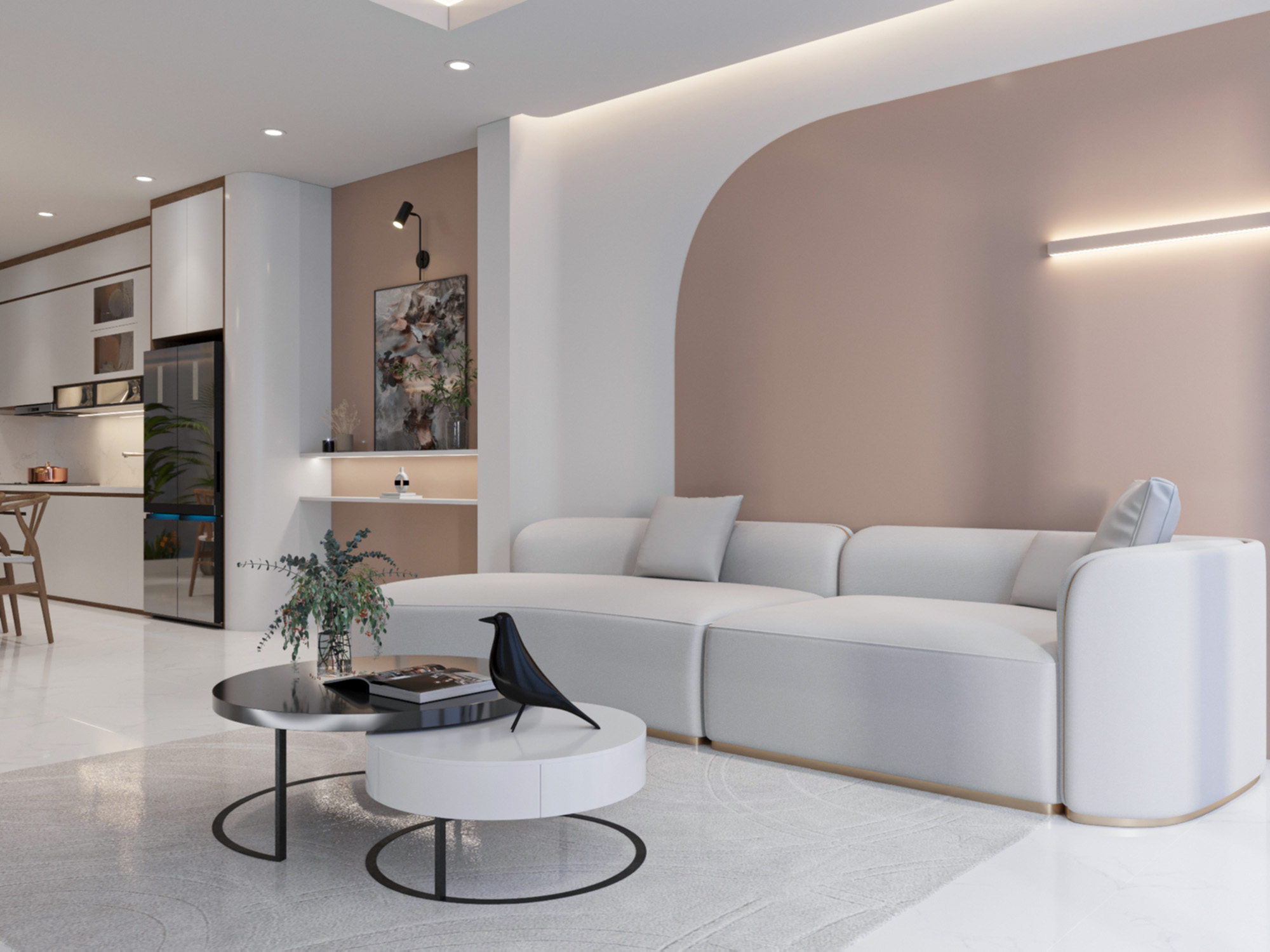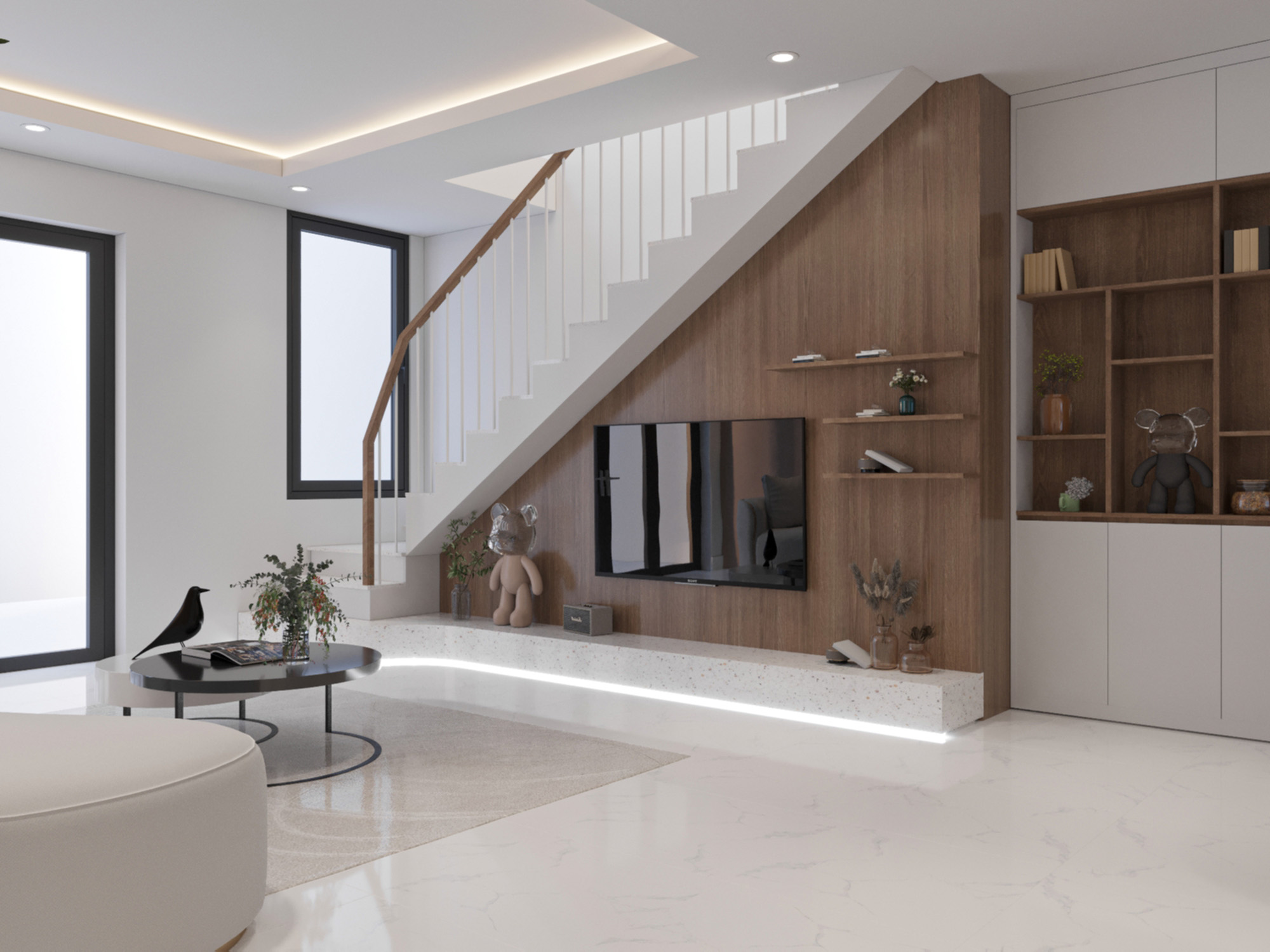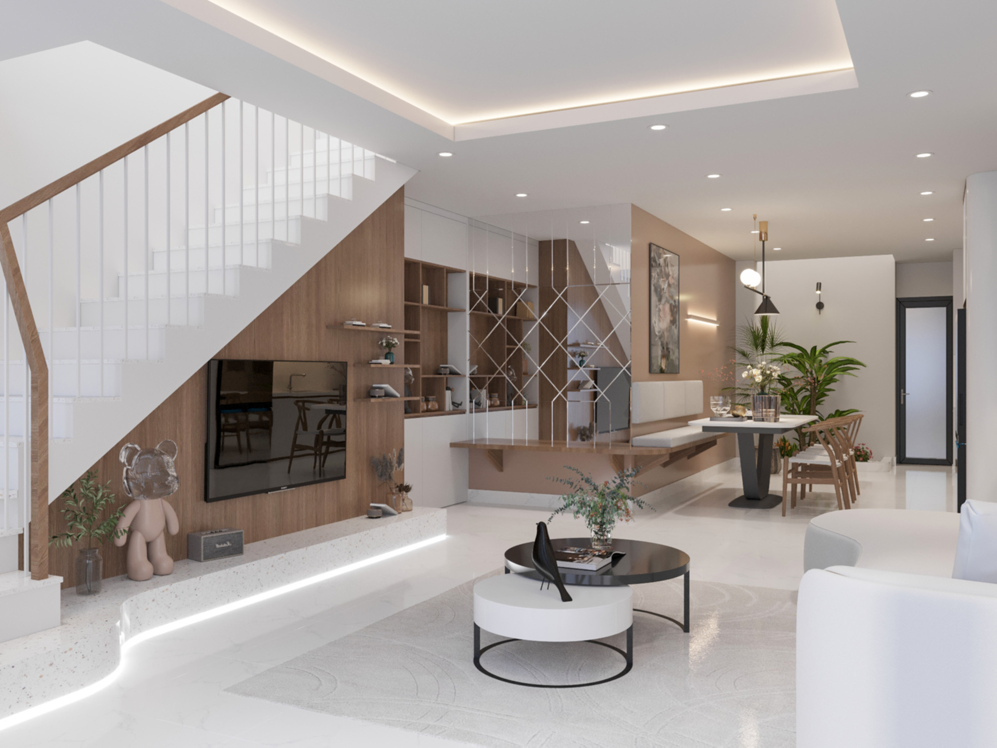 Không gian sinh hoạt chính của gia đình anh Long mang đậm phong cách sang trọng hiện đại với các đường nét kiến trúc đơn giản, mạnh mẽ. Việc sử dụng các vật liệu như gỗ, kính, kim loại là những yếu tố góp phần tạo nên không gian sống sang trọng và hiện đại. Bên cạnh sự hiện đại, không gian sống còn toát lên vẻ ấm cúng nhờ vào việc sử dụng gam màu trung tính, ánh sáng tự nhiên và các chi tiết trang trí mềm mại. Cầu thang được thiết kế với lan can kính và bậc gỗ, vừa đảm bảo sự thông thoáng vừa tạo điểm nhấn cho không gian. Tường gỗ phía sau tivi tạo điểm nhấn ấm áp, kết hợp với kệ trang trí giúp không gian thêm phần sinh động. Bàn ăn được đặt gần cửa sổ, giúp tận dụng ánh sáng tự nhiên và mang đến cảm giác thoải mái khi dùng bữa. Sofa màu trắng tinh tế, kết hợp với bàn trà tròn tạo nên không gian tiếp khách sang trọng. Hệ thống đèn chiếu sáng được bố trí hợp lý, vừa đủ sáng vừa tạo điểm nhấn cho không gian. Phòng khách được thiết kế mở, kết nối với các không gian khác, tạo cảm giác rộng rãi và thông thoáng. Các khu vực chức năng được bố trí hợp lý, tận dụng tối đa diện tích. Nội thất được lựa chọn kỹ lưỡng, tạo nên một không gian sống đẹp mắt và hài hòa.