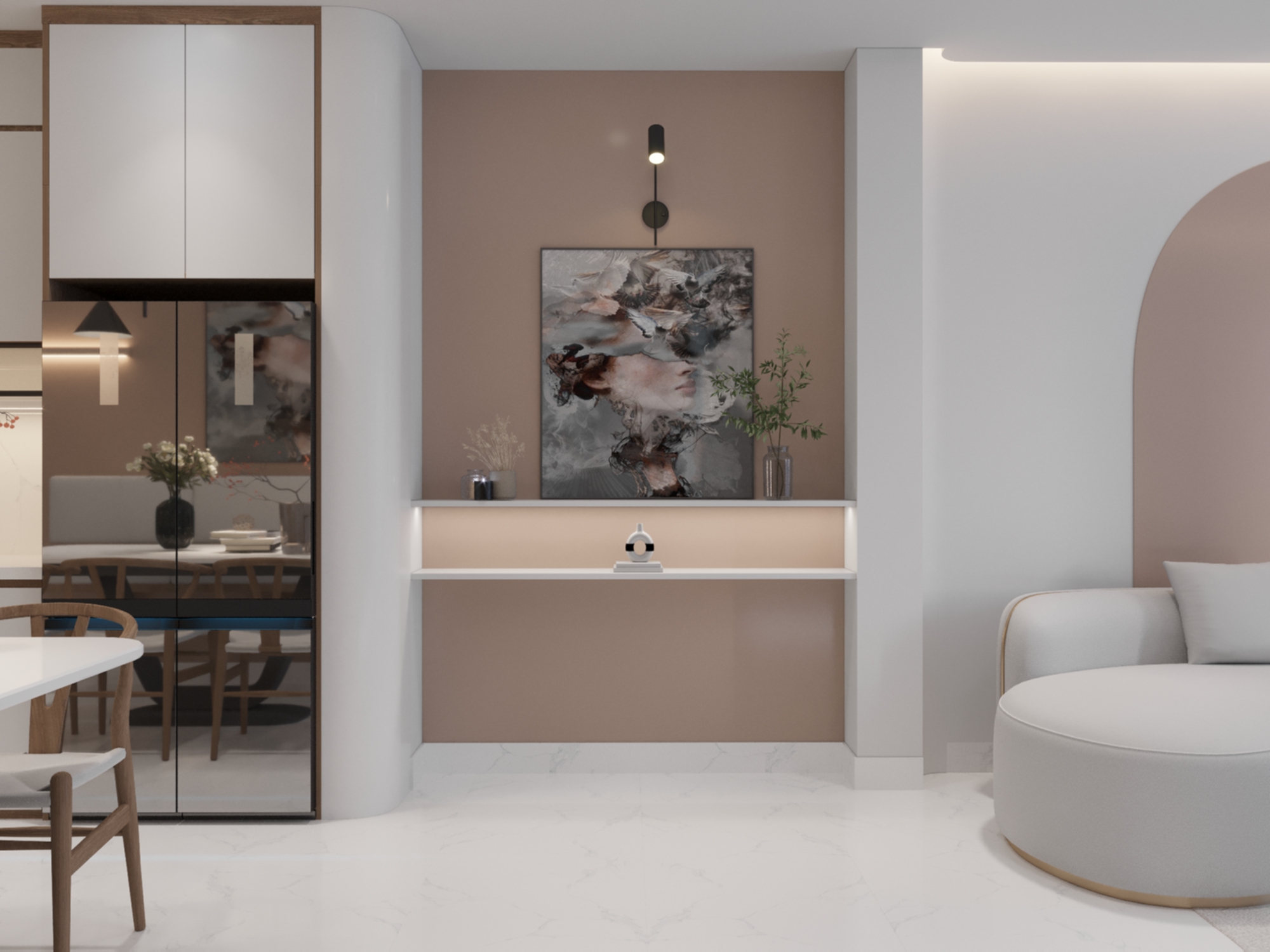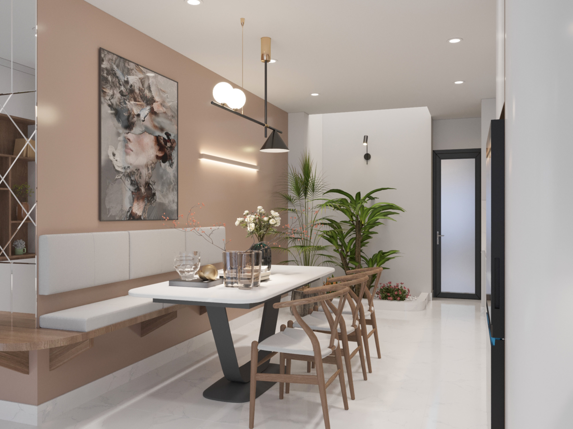 Không gian bếp mang đậm phong cách sang trọng, hiện đại với các đường nét kiến trúc đơn giản, mạnh mẽ. Việc sử dụng các vật liệu như gỗ, kính, kim loại tạo nên không gian sống sang trọng và hiện đại. Thiết kế tủ bếp với phần tủ trên màu trắng và phần tủ dưới màu gỗ tạo sự tương phản và cân bằng về màu sắc, tạo điểm nhấn giúp không gian trở nên sinh động và thú vị. Bên cạnh sự hiện đại, không gian bếp còn toát lên vẻ ấm cúng nhờ vào việc sử dụng gam màu trung tính, ánh sáng tự nhiên và các chi tiết trang trí mềm mại. Tường được sơn màu be nhẹ nhàng, tạo nền tảng cho các chi tiết nội thất khác. Việc kết hợp với tranh treo tường và đèn led tạo điểm nhấn cho bức tường. Tủ bếp được trang bị đầy đủ các ngăn kéo, kệ để đồ, đáp ứng nhu cầu sử dụng của người dùng. Bàn ăn được đặt gần cửa sổ, giúp tận dụng ánh sáng tự nhiên và mang đến cảm giác thoải mái khi dùng bữa. Bàn ăn có thiết kế đơn giản, kết hợp với ghế ăn gỗ tạo nên không gian ăn uống ấm cúng. Ghế ăn bằng gỗ với thiết kế lưng tựa uốn cong mang lại cảm giác thoải mái cho người ngồi. Ghế băng liền tường với phần nệm êm ái tạo không gian ngồi thư giãn. Tủ lạnh màu đồng nổi bật, tạo điểm nhấn cho không gian bếp. Hệ thống đèn chiếu sáng được bố trí hợp lý, vừa đủ sáng vừa tạo điểm nhấn cho không gian. Sàn nhà được lát gạch men sáng màu, tạo cảm giác rộng rãi và sạch sẽ. Ngoài ra, cây xanh được đặt trong chậu trang trí, mang đến không gian xanh mát và gần gũi với thiên nhiên.