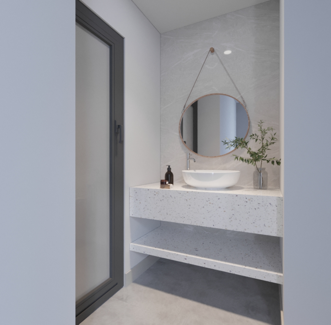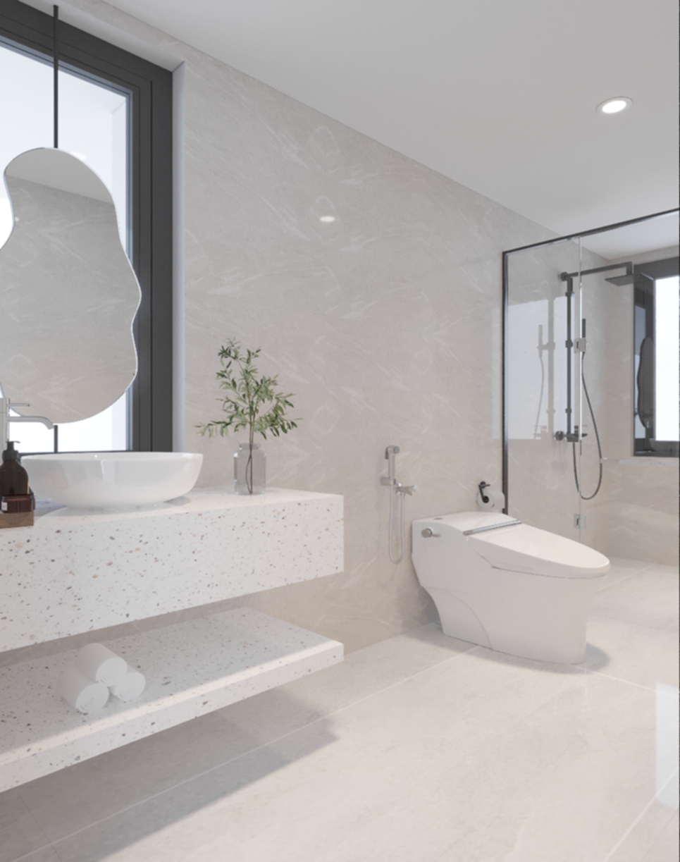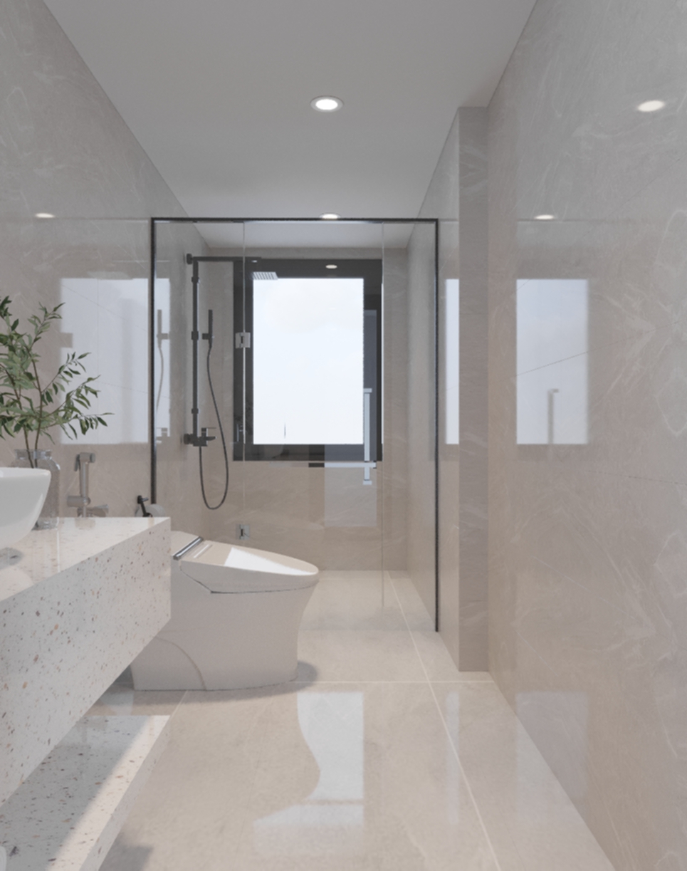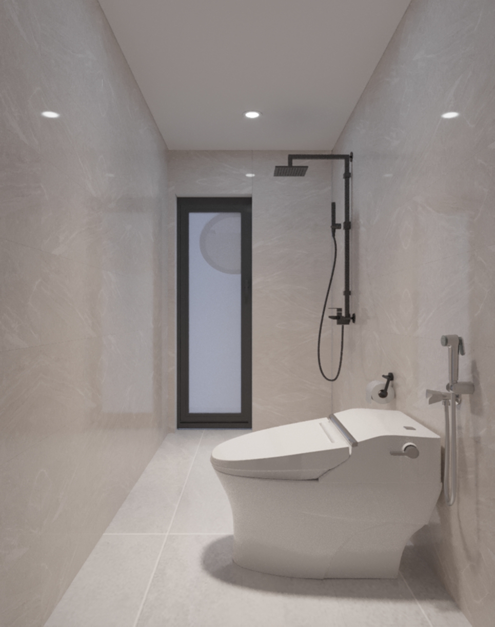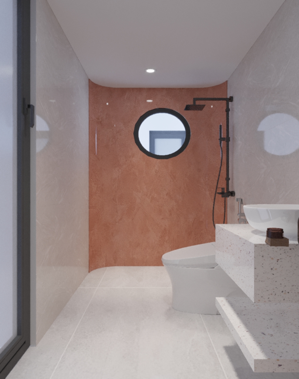 Phòng tắm được thiết kế và lắp đặt các nội thất vô cùng tiện nghi cà hiện đại. Tạo điểm nhấn là mảng tường màu đỏ gạch, kết hợp cùng khung cửa được thiết kế kiểu hình tròn, giúp cho không gian trở nên đặc biệt hơn. Hệ thống bồn rửa sử dụng chất liệu đá tự nhiên, tạo cảm giác sang trọng. Sàn nhà được lát gạch men sáng màu, dễ dàng vệ sinh và tạo cảm giác sạch sẽ. Tổng quan, thiết kế tập trung vào những đường nét cơ bản, hạn chế các chi tiết rườm rà, tạo cảm giác thông thoáng và sạch sẽ cho không gian. Việc sử dụng hệ thống vách ngăn kính giữa không gian tắm rửa và không gian vệ sinh giúp đảm bảo được yếu tố thẩm mỹ cho không gian, đồng thời tạo được vẻ đẹp sang trọng của phong cách hiện đại.
