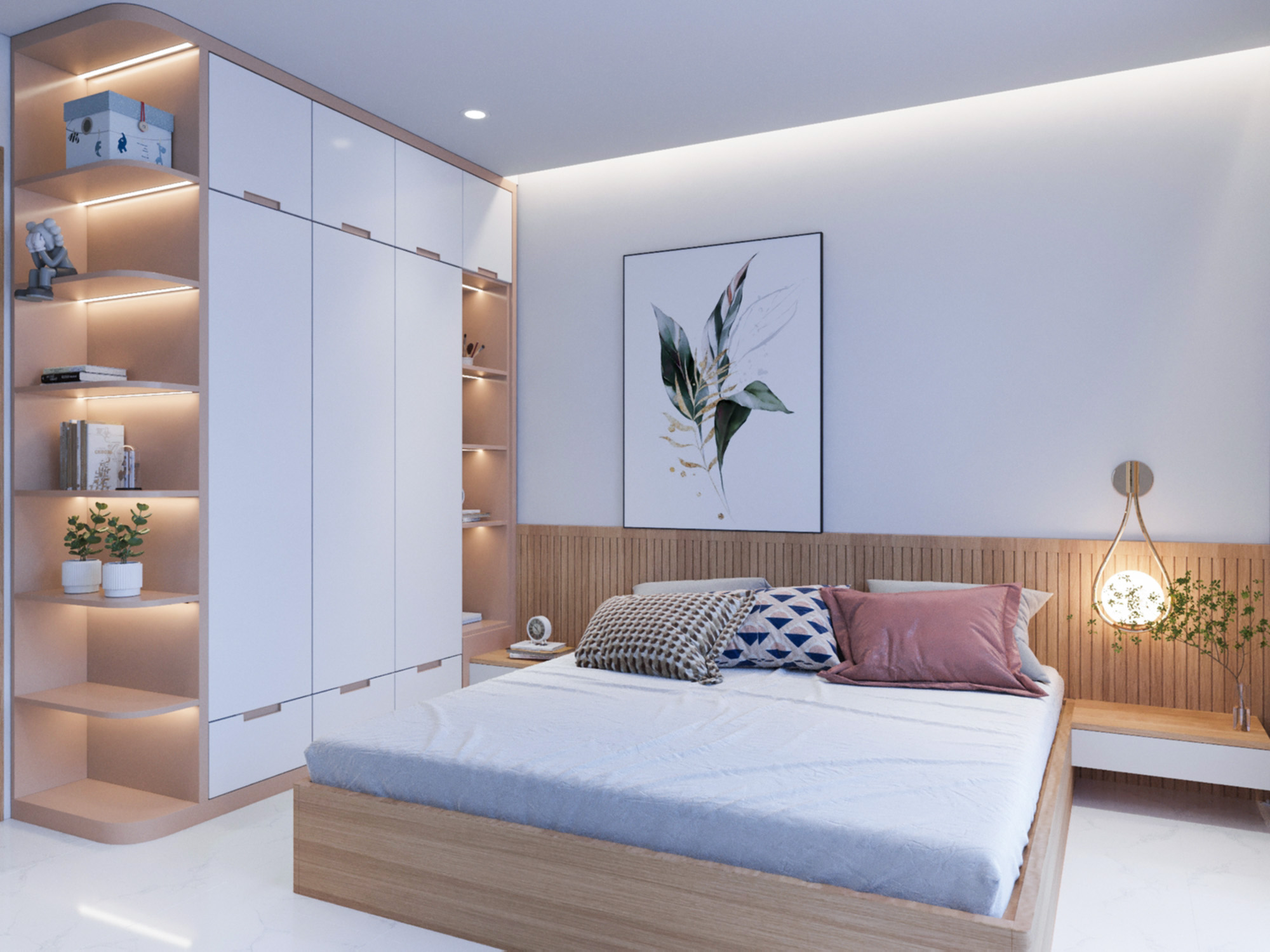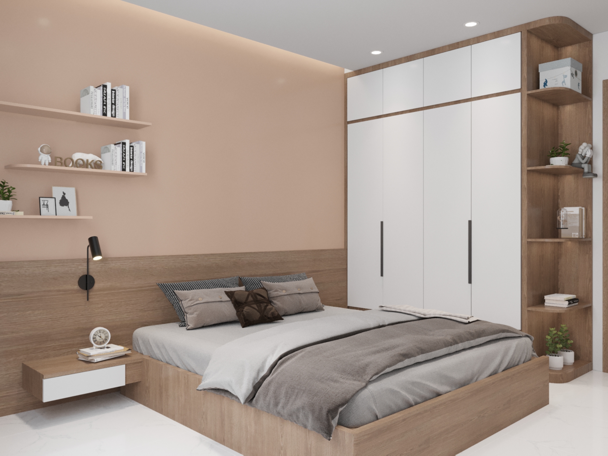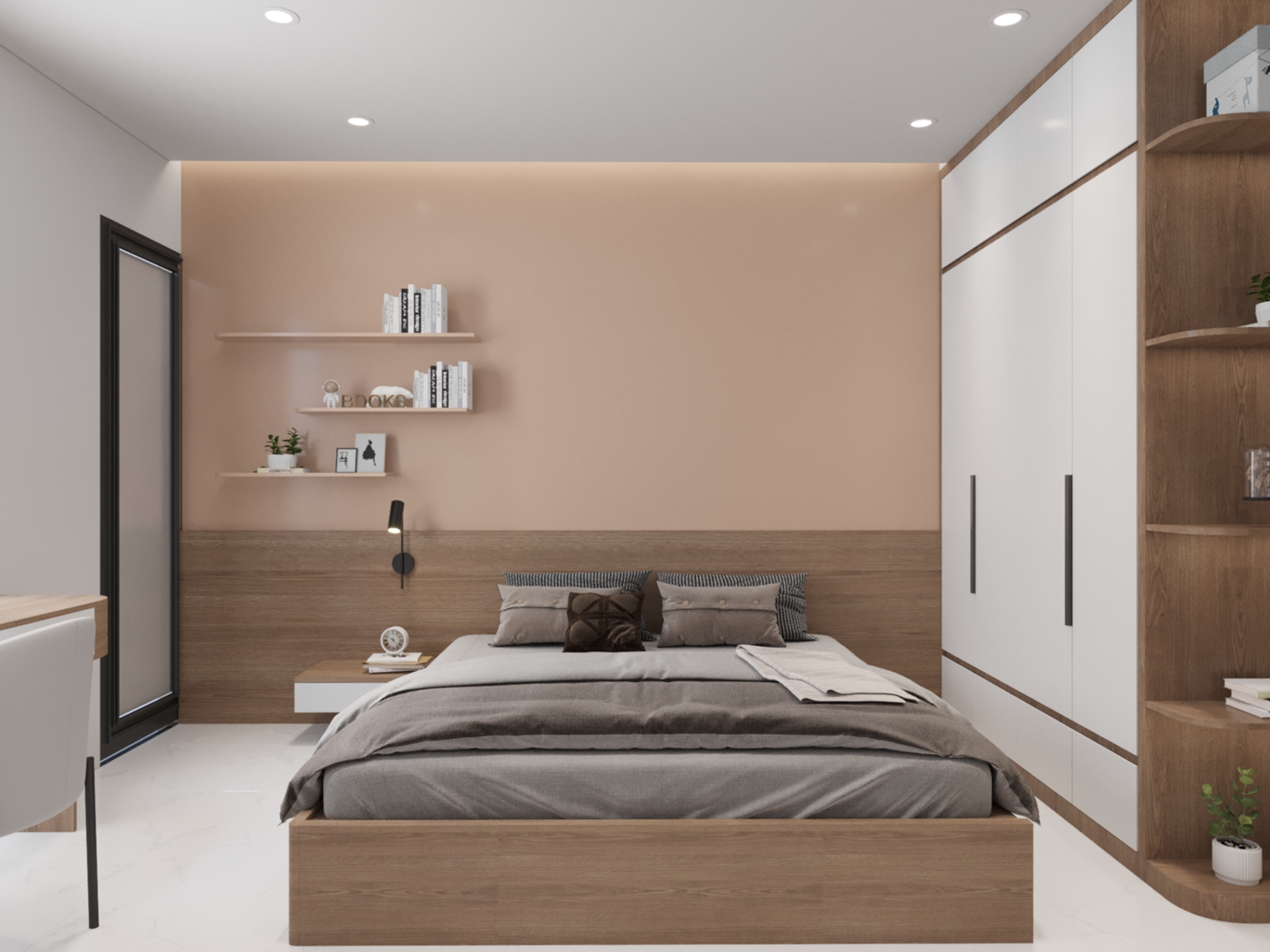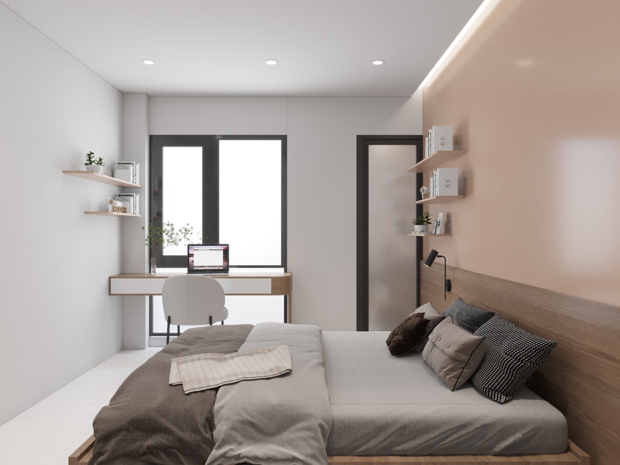 Phòng ngủ mang đậm phong cách hiện đại với các đường nét kiến trúc đơn giản, mạnh mẽ. Việc sử dụng các vật liệu như gỗ, sơn tường màu trung tính tạo nên không gian sống tinh tế và hiện đại với gam màu chủ đạo trắng và màu gỗ, tạo cảm giác rộng rãi và ấm áp. Không gian được thiết kế tối ưu hóa diện tích, tích hợp nhiều chức năng như ngủ, làm việc, học tập. Bên cạnh sự hiện đại, không gian phòng ngủ còn toát lên vẻ ấm cúng nhờ vào việc sử dụng gam màu trung tính, ánh sáng dịu nhẹ và các chi tiết trang trí nhỏ nhắn. Giường ngủ được thiết kế sát tường, tận dụng tối đa diện tích. Tủ quần áo âm tường, thiết kế cánh trượt giúp tiết kiệm diện tích và tạo cảm giác gọn gàng. Bàn làm việc được tích hợp vào khung giường, tạo thành một không gian làm việc nhỏ gọn nhưng vẫn đầy đủ tiện nghi. Kệ sách được thiết kế mở, giúp bạn trưng bày sách, đồ trang trí và cây xanh. Hệ thống đèn chiếu sáng được bố trí hợp lý, vừa đủ sáng vừa tạo điểm nhấn cho không gian.