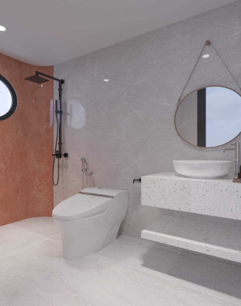 Phòng tắm được thiết kế và lắp đặt các nội thất vô cùng tiện nghi cà hiện đại. Tạo điểm nhấn là mảng tường màu đỏ gạch, kết hợp cùng khung cửa được thiết kế kiểu hình tròn, giúp cho không gian trở nên đặc biệt hơn. Hệ thống bồn rửa sử dụng chất liệu đá tự nhiên, tạo cảm giác sang trọng. Sàn nhà được lát gạch men sáng màu, dễ dàng vệ sinh và tạo cảm giác sạch sẽ. Tổng quan, thiết kế tập trung vào những đường nét cơ bản, hạn chế các chi tiết rườm rà, tạo cảm giác thông thoáng và sạch sẽ cho không gian. Việc sử dụng hệ thống vách ngăn kính giữa không gian tắm rửa và không gian vệ sinh giúp đảm bảo được yếu tố thẩm mỹ cho không gian, đồng thời tạo được vẻ đẹp sang trọng của phong cách hiện đại.
