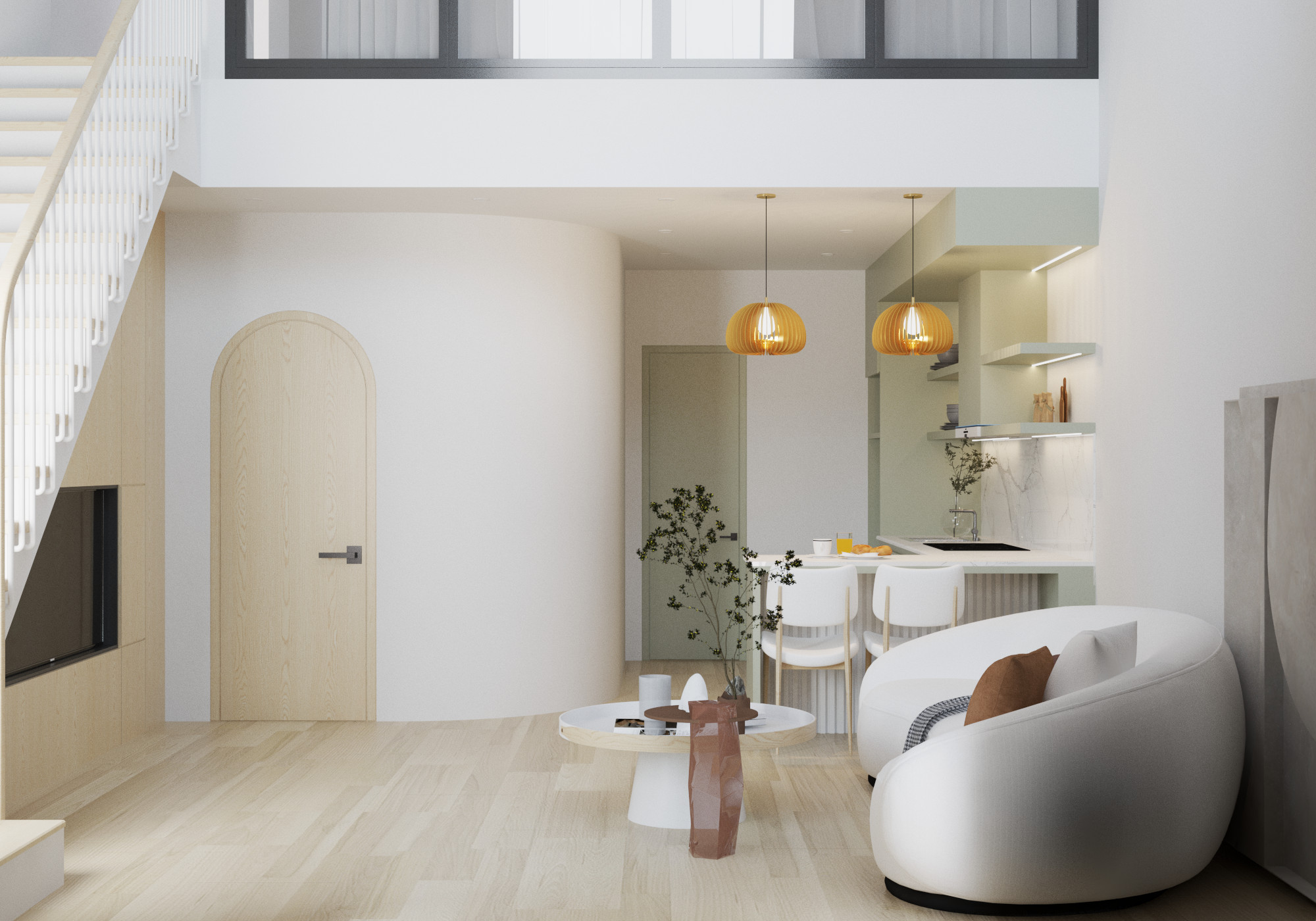 Yêu cầu thiết kế: Tông trắng chủ đạo tạo cảm giác hài hòa, thư thái cho gia chủ – Kiến tạo không gian sống nhẹ nhàng, thanh lịch với phong cách tối giản, thanh lịch, đáp ứng công năng 1 phòng khách, 1 phòng bếp, 1 phòng tắm, 1 phòng ngủ.