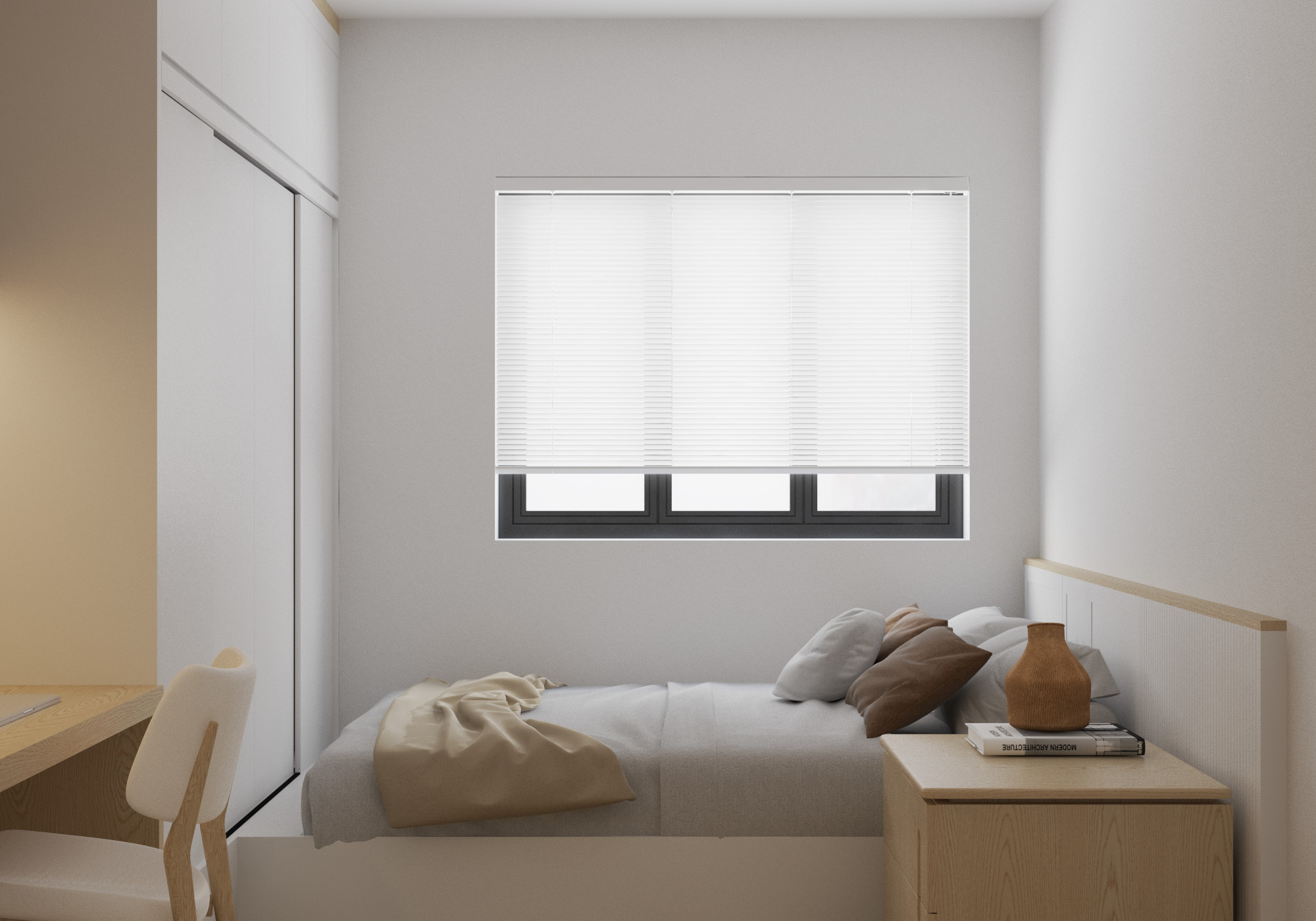 Căn phòng thể hiện rõ nét phong cách tối giản với đường nét thiết kế đơn giản, không cầu kỳ, pha lẫn một chút phong cách Nhật Bản qua việc sử dụng gỗ tự nhiên, màu sắc ấm áp với nội thất và cách bày trí trong phòng. Việc sử dụng chủ yếu các hình khối cơ bản, màu sắc nhẹ nhàng trung tính và hạn chế đồ trang trí tạo nên không gian gọn gàng, tinh tế. Căn phòng được thiết kế đa năng, vừa là phòng ngủ vừa là không gian làm việc Vật liệu gỗ được sử dụng làm điểm nhấn cho bức tường phía sau bàn làm việc, mang đến cảm giác ấm cúng, thoải mái. Tủ quần áo được thiết kế âm tường giúp tiết kiệm không gian và tạo nên vẻ ngoài gọn gàng cho căn phòng. Việc sử dụng ánh sáng gián tiếp từ đèn LED âm tường tạo ra không gian làm việc thoải mái và thư giãn. Cửa vòm mang đến nét mềm mại và độc đáo cho căn phòng. Sàn gỗ giúp tăng thêm vẻ đẹp tự nhiên và ấm áp cho không gian. Đây thực sự là một góc lý tưởng giúp chị Hiền có thể tập trung làm việc và nghỉ ngơi.