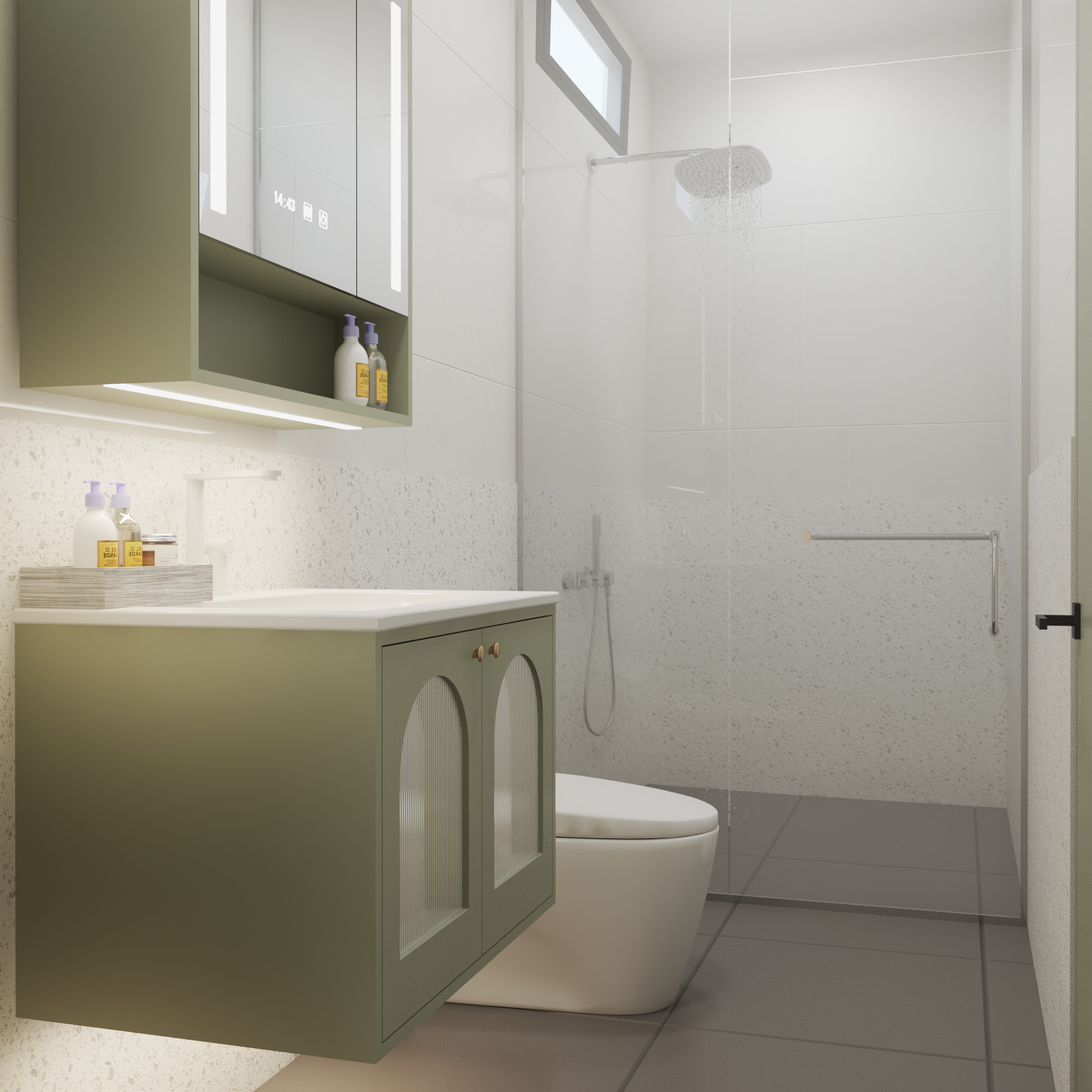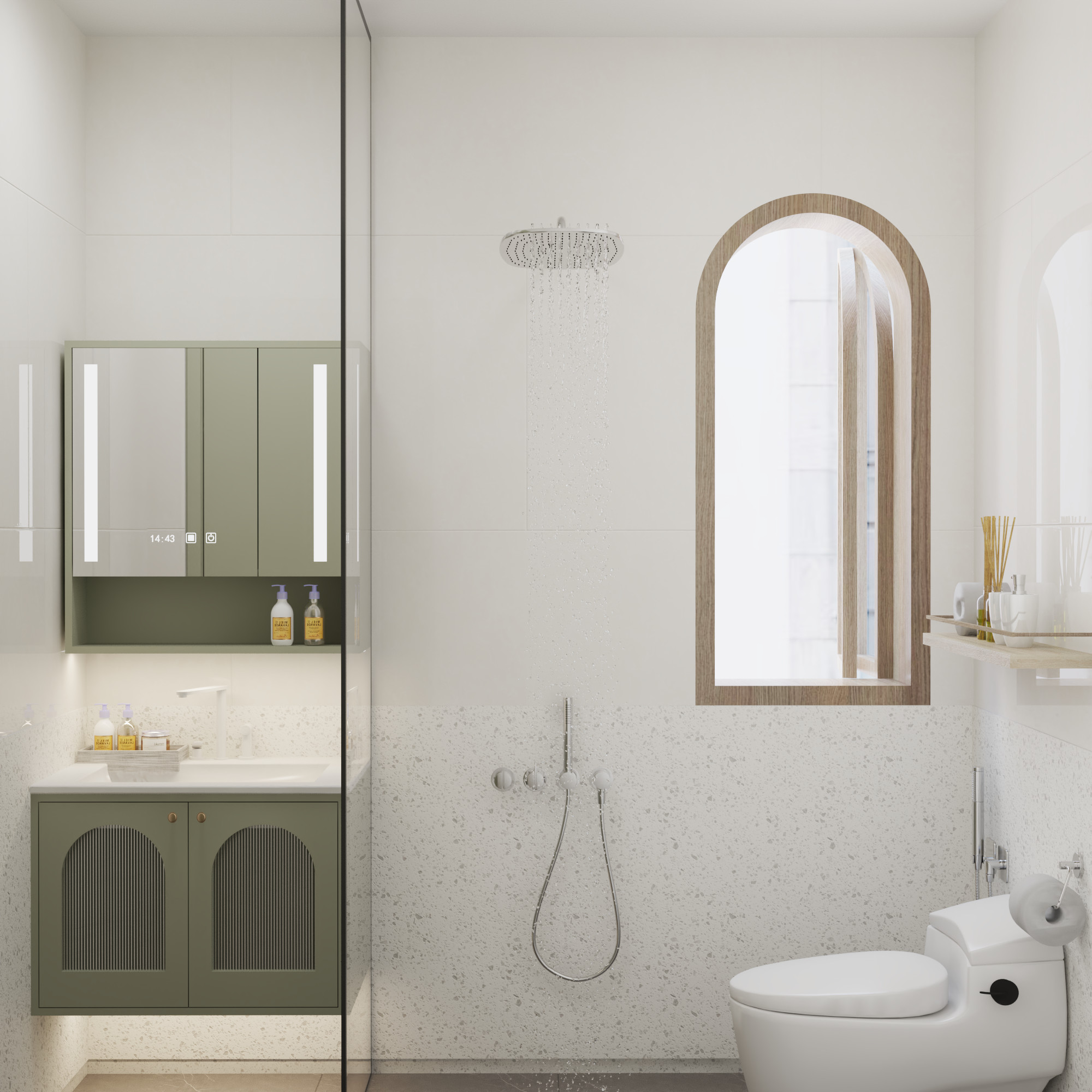 Phòng tắm cũng mang đậm phong cách thiết kế tối giản, hiện đại với các đường nét đơn giản, không quá cầu kỳ. Sự kết hợp hài hòa giữa gạch ốp tường vân đá tự nhiên, gỗ và kính tạo nên một không gian gần gũi với thiên nhiên, mang lại cảm giác nhẹ nhàng thư thái. Chi tiết cửa sổ vòm và các đường kẻ trên tủ lavabo mang đến một chút hơi hướng vintage, tạo điểm nhấn thú vị cho căn phòng. Phòng tắm được ốp oại gạch vân đá tự nhiên với tông màu sáng, tạo cảm giác rộng rãi và sang trọng cho không gian. Tủ chứa đồ và bục rửa mặt cũng được thiết kế đơn giản với gam màu xanh lá vintage, điểm nhấn với chi tiết vòm ở các cánh tủ. Gương lớn với đèn LED giúp không gian trở nên sáng sủa hơn và thuận tiện cho việc sinh hoạt. Cửa sổ vòm bằng gỗ mang đến ánh sáng tự nhiên và tạo điểm nhấn độc đáo cho căn phòng. Vòi sen hiện đại với thiết kế đơn giản, dễ sử dụng. Bồn cầu treo tường giúp không gian trở nên gọn gàng và dễ vệ sinh. Sự kết hợp giữa màu trắng của gạch, màu nâu của gỗ và màu xanh của cây tạo nên một không gian hài hòa và dễ chịu.