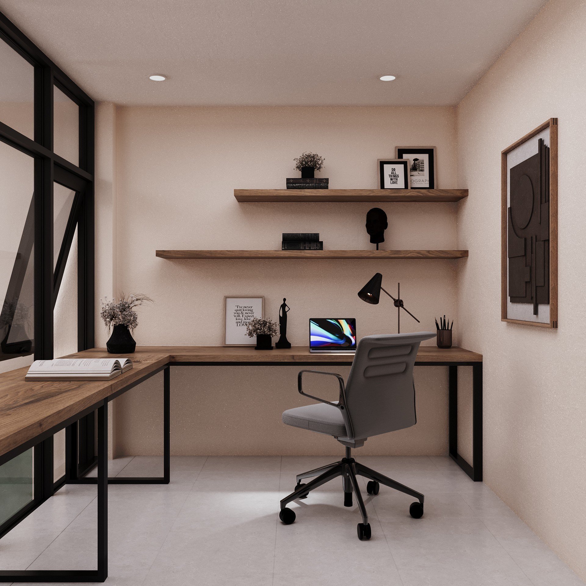 Góc làm việc của chị Huế cũng được sắp xếp một cách khoa học và ngăn nắp, với sự kết hợp giữa màu sắc trung tính trắng, be, nâu gỗ và đen, chất liệu gỗ tự nhiên và khung sắt tạo nên một không gian làm việc chuyên nghiệp và sang trọng. Bố cục phòng được thiết kế khoa học, tận dụng tối đa không gian trống. Bàn làm việc hình chữ L tạo ra một góc làm việc rộng rãi và thoải mái. Việc lắp đặt cửa sổ lớn cũng nhằm bắt trọn ánh sáng tự nhiên, giúp không gian làm việc được thoải mái, dễ chịu. Hệ thống đèn chiếu sáng bổ sung giúp điều chỉnh ánh sáng tùy theo nhu cầu sử dụng. Bàn làm việc bằng gỗ được lựa chọn bố trí hình chữ L kết hợp với khung sắt tạo nên sự chắc chắn và hiện đại. Ghế làm việc có lưng tựa và tay vịn giúp người dùng ngồi làm việc thoải mái trong thời gian dài. Kệ sách gỗ được thiết kế mở giúp sắp xếp tài liệu gọn gàng và tạo điểm nhấn cho không gian. Các bức tranh treo tường và các vật dụng trang trí nhỏ tạo điểm nhấn cho không gian làm việc, giúp không gian trở nên sinh động hơn.