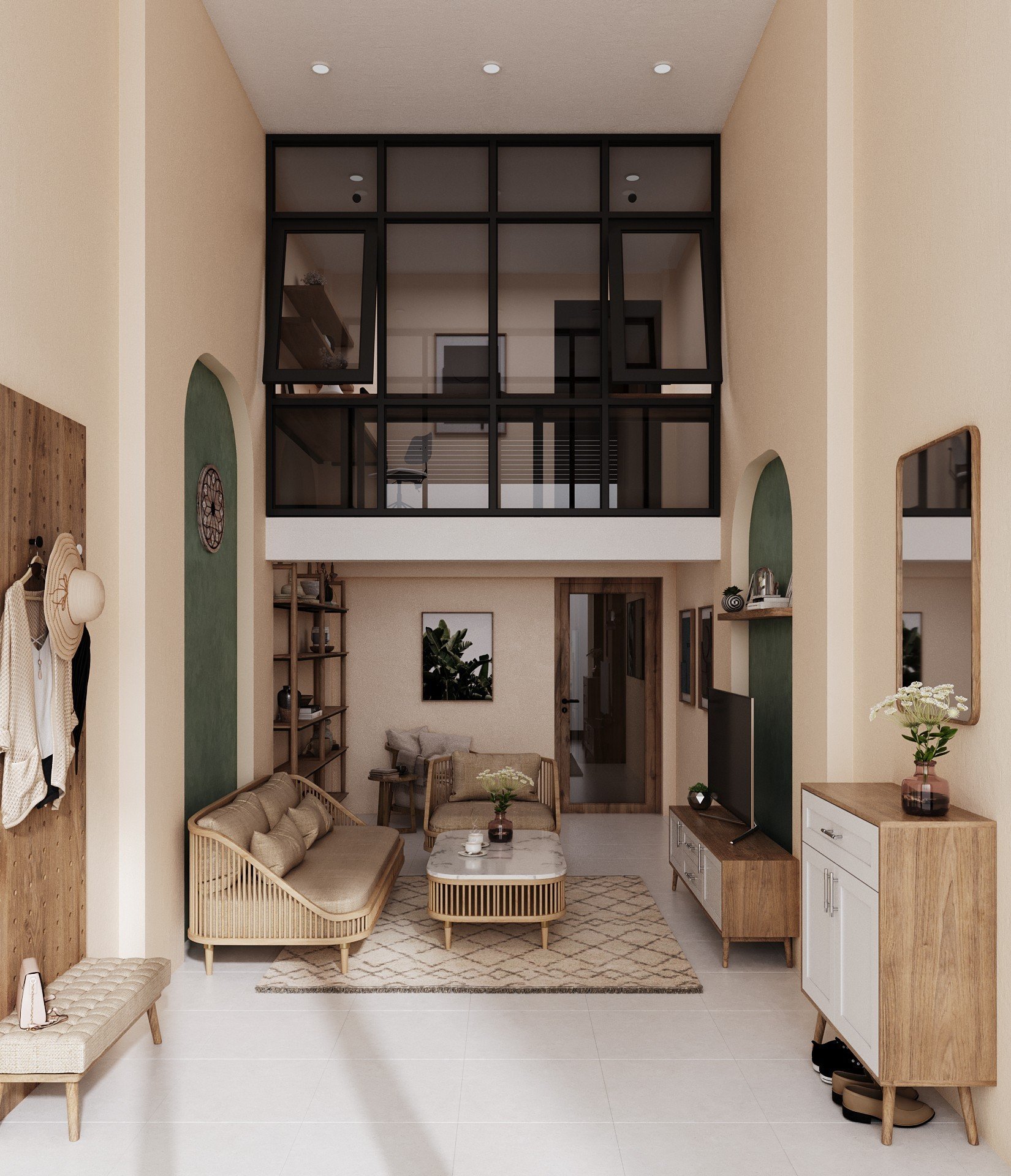 Không gian chính trong nhà mang phong cách thiết kế hiện đại pha trộn với nét tinh tế của phong cách rustic hiện đại, tối giản. Sự kết hợp hài hòa giữa các yếu tố tự nhiên và vật liệu nhân tạo tạo nên một không gian sống vừa ấm cúng, vừa sang trọng. Sự phối hợp màu sắc hài hòa, tạo nên một không gian sống cân bằng và tinh tế. Không gian được tạo điểm nhấn với sự xuất hiện của hai mảng tường màu xanh lá, hòa quyện cùng với gam màu chủ đạo là màu be, tạo cảm giác thư thái, gần gũi với thiên nhiên. Màu nâu gỗ của nội thất tạo điểm nhấn ấm áp, gần gũi. Căn phòng được thiết kế với nhiều cửa sổ lớn, tận dụng tối đa ánh sáng tự nhiên, giúp không gian luôn  tràn đầy sức sống. Hệ thống đèn trần và đèn âm tường cung cấp đủ ánh sáng cho các hoạt động sinh hoạt, giúp không gian trở nên ấm cúng  hơn. Từ kệ tivi, kệ sách, bàn ghế cũng như tranh trang trí, chị Huế đều lựa chọn chất liệu gỗ bởi chị muốn đem sự ấm áp và hơi thở của thiên nhiên bao trùm lấy không gian sống của chị, giúp chị thư giãn tinh thần cách tốt nhất.  Sofa bằng mây tre đan thủ công mang đến cảm giác thoải mái, gần gũi với thiên nhiên. Bàn trà mặt đá cẩm thạch kết hợp với chân bàn bằng gỗ tạo điểm nhấn sang trọng cho không gian. Lựa chọn kệ trang trí đồ gốm bằng gỗ giúp hài hòa vẻ đẹp của sự mộc mạc, đơn giản. Nhìn vào không gian này có thể thấy rõ được phong cách sống nhẹ nhàng, gần gũi của chị Huế, phản ánh trong từng món đồ trong gian phòng.