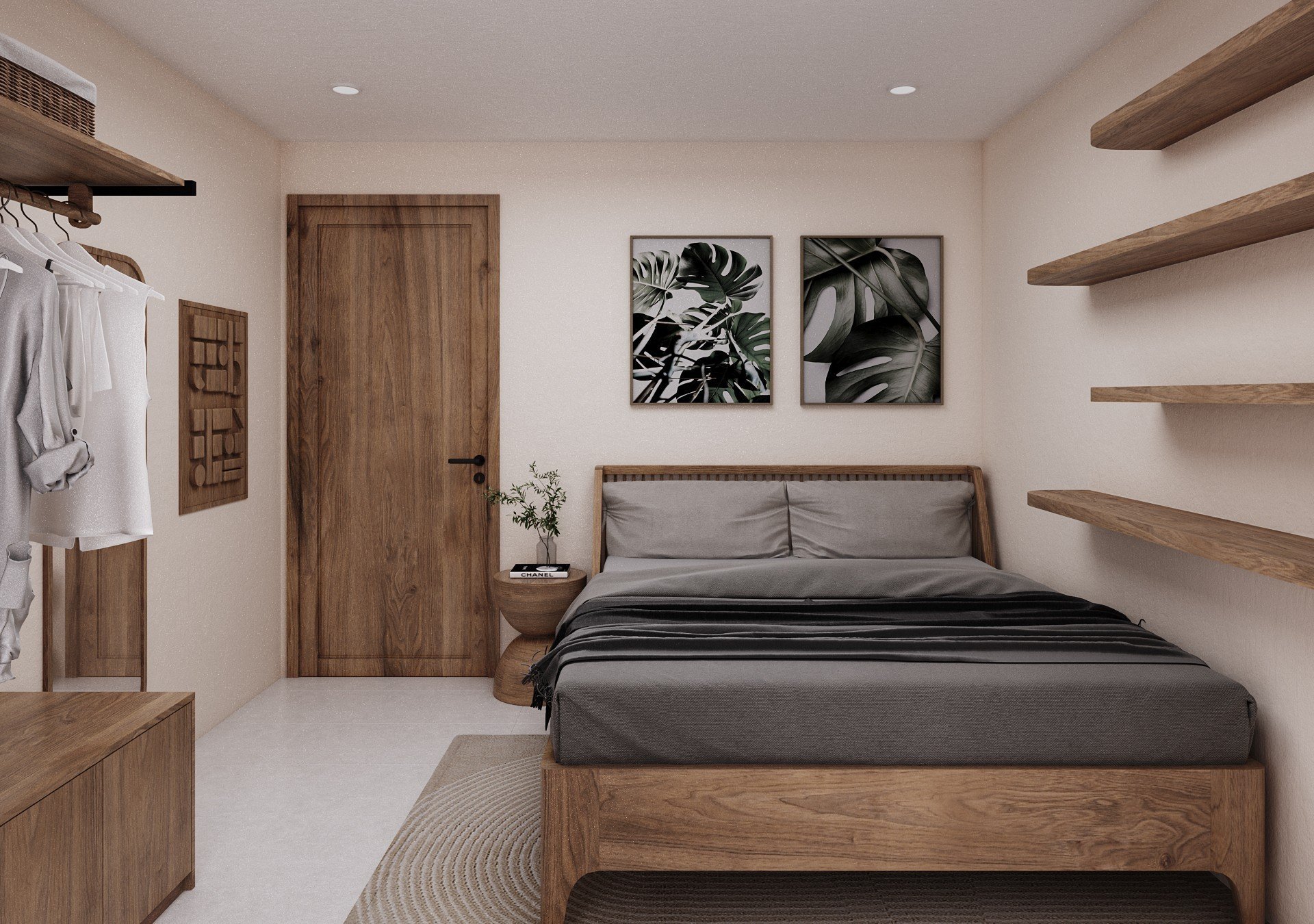 Khu vực phòng ngủ cũng mang đậm hơi thở của  phong cách rustic hiện đại, tối giản nhưng vẫn giữ được nét ấm cúng nhờ chất liệu gỗ tự nhiên. Từ cửa ra vào đến khung giường, tủ quần áo…chị Huế đều lựa chọn vật liệu chính là gỗ tự nhiên, giúp gửi gắm tâm hồn hòa quyện chung với thiên nhiên, mang lại cảm giác an yên, thoải mái.   Sự kết hợp giữa màu sắc trung tính trắng, be, nâu gỗ, chất liệu gỗ và các đường nét đơn giản tạo nên một không gian nghỉ ngơi thư thái và sang trọng. Bố cục phòng được thiết kế khoa học, tận dụng tối đa không gian. Giường ngủ được đặt ở vị trí trung tâm, tạo điểm nhấn cho căn phòng. Giường ngủ bằng gỗ tự nhiên với đầu giường được thiết kế tinh tế tạo điểm nhấn cho căn phòng. Ga giường màu xám tạo cảm giác sang trọng và dễ chịu. Tủ quần áo và kệ sách được chị lựa chọn thiết kế mở giúp sắp xếp đồ đạc gọn gàng và tạo không gian lưu trữ. Các bức tranh treo tường và cây xanh giúp không gian trở nên sinh động hơn. Hệ thống đèn âm trần cũng góp phần tô điểm cho không gian nghỉ ngơi thêm ấm áp, dễ chịu.