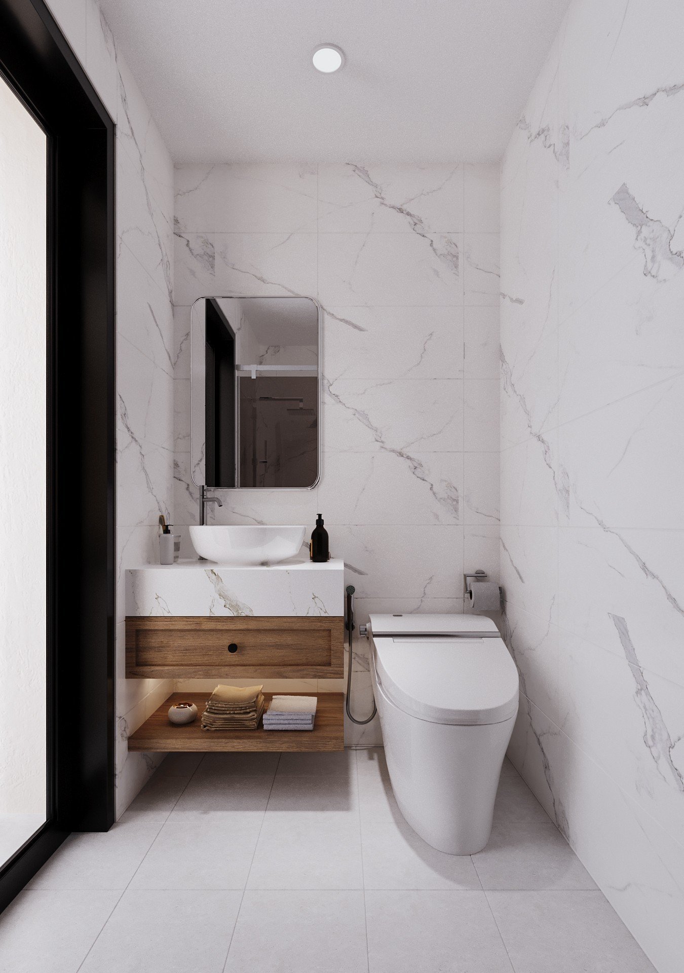 Khu vực phòng tắm này cũng đảm bảo được sự cổ điển của phong cách  rustic hiện đại, tối giản qua việc sử dụng chất liệu gỗ để thiết kế tủ và kệ đựng đồ. Sự kết hợp hài hòa giữa màu sắc, chất liệu và ánh sáng tạo nên một không gian thư giãn và thoải mái. Gam màu trắng chủ đạo của đá cẩm thạch tạo cảm giác rộng rãi, sạch sẽ và tạo nên vẻ đẹp sang trọng, bền bỉ và dễ vệ sinh. Màu nâu gỗ của tủ lavabo tạo điểm nhấn ấm áp và gần gũi với thiên nhiên. Chất liệu sứ được sử dụng cho bồn cầu và lavabo, mang đến vẻ đẹp tinh tế và dễ vệ sinh. Ánh sáng tự nhiên (qua cửa kính) kết hợp với ánh sáng nhân tạo từ đèn trần tạo nên không gian đủ sáng, giúp các hoạt động diễn ra dễ dàng và tạo cảm giác thư thái. Lavabo được thiết kế đơn giản, hiện đại với mặt đá cẩm thạch và tủ gỗ bên dưới giúp tạo không gian lưu trữ. Bồn cầu được thiết kế hiện đại, tích hợp nhiều tính năng thông minh. Tổng thể bố cục phòng tắm được thiết kế khoa học, các thiết bị vệ sinh được sắp xếp hợp lý, tạo nên sự tiện nghi và thoải mái khi sử dụng.