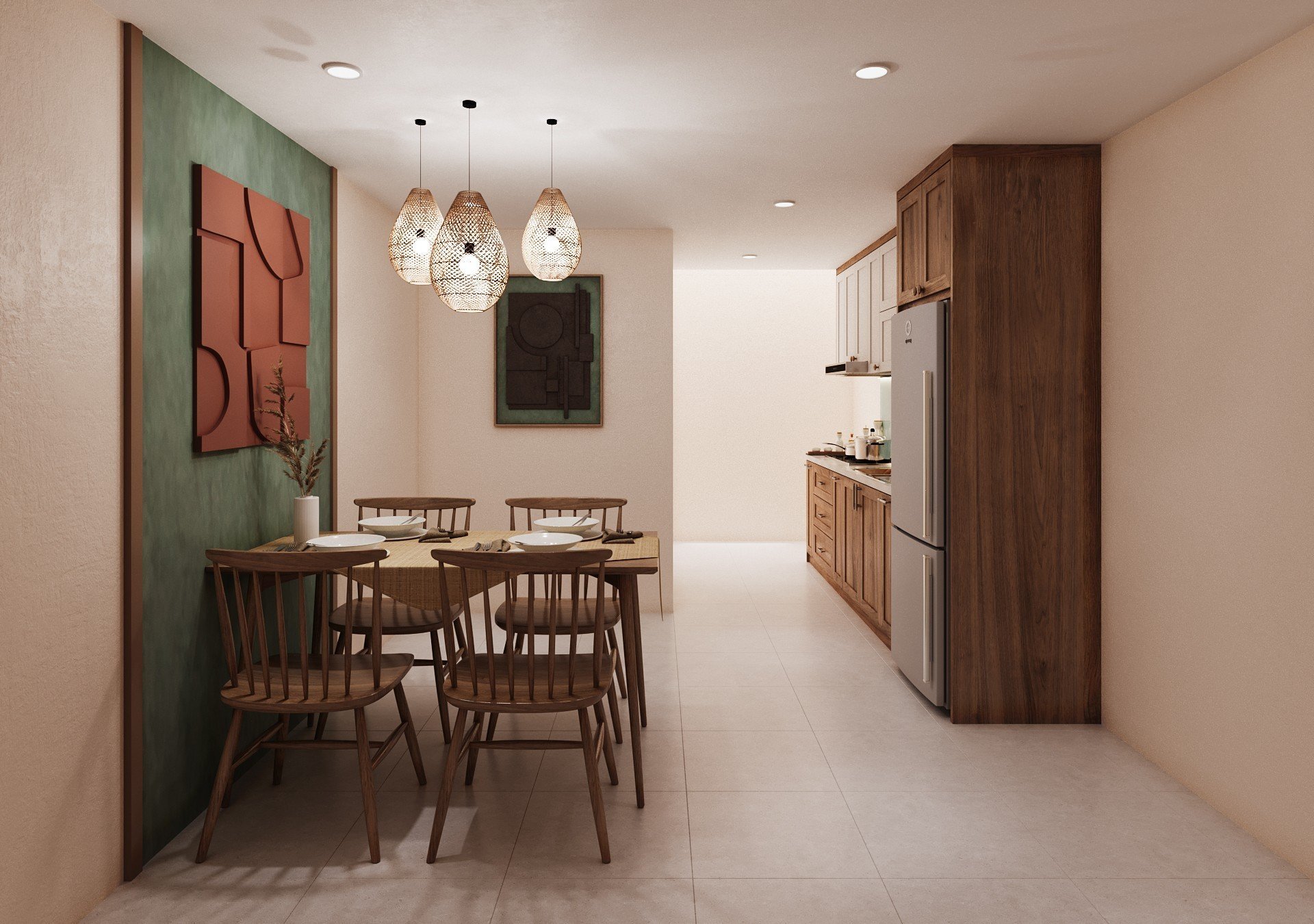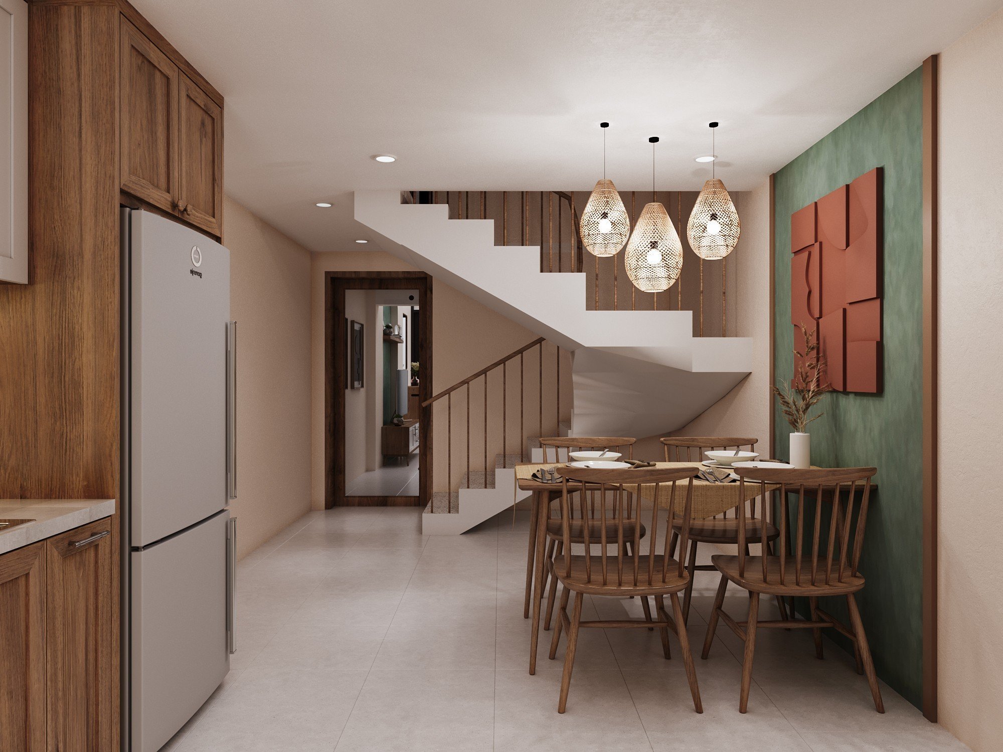 Sang không gian bếp, nơi chị có thể thỏa sức sáng tạo những món ăn ngon cho gia đình nhỏ của mình cũng mang đậm phong cách rustic hiện đại, tối giản pha trộn với nét ấm cúng của chất liệu gỗ tự nhiên và màu sắc trung tính. Sự kết hợp giữa bức tường xanh lá cây nổi bật với các họa tiết hình học và đồ nội thất gỗ tạo nên một không gian sống động nhưng vẫn giữ được sự tinh tế. Bố cục căn phòng khá đơn giản, khoa học, tận dụng tối đa diện tích. Khu vực ăn uống được bố trí ngay trung tâm, nổi bật với mảng tường màu xanh lá vô cùng dịu mắt, với bàn ăn gỗ tự nhiên kết hợp với ghế gỗ tạo nên một không gian ấm cúng, thân thiện tạo điểm nhấn cho không gian. Hệ thống đèn thả trần bằng mây tre đan mang đến ánh sáng dịu nhẹ, tạo không khí ấm cúng. Việc kết hợp với đèn âm trần giúp cân bằng ánh sáng và tạo điểm nhấn cho các góc khác nhau của căn phòng. Gam màu chủ đạo là màu trắng, be, nâu gỗ và xanh lá cây. Sự kết hợp hài hòa giữa các màu sắc này tạo cảm giác thư thái, gần gũi với thiên nhiên. Bếp được bố trí gọn gàng, khoa học, liền mạch với tủ lạnh. Nội thất trong phòng bếp cũng được ưu tiên sử dụng chất liệu gỗ, vừa đảm bảo tính thẩm mỹ, vừa đảm bảo sự tiện nghi cho căn phòng. Tủ lạnh được đặt âm tường giúp tiết kiệm diện tích và tạo sự gọn gàng cho không gian. Sàn nhà được lát gạch men sáng màu, tạo cảm giác rộng rãi, sạch sẽ.